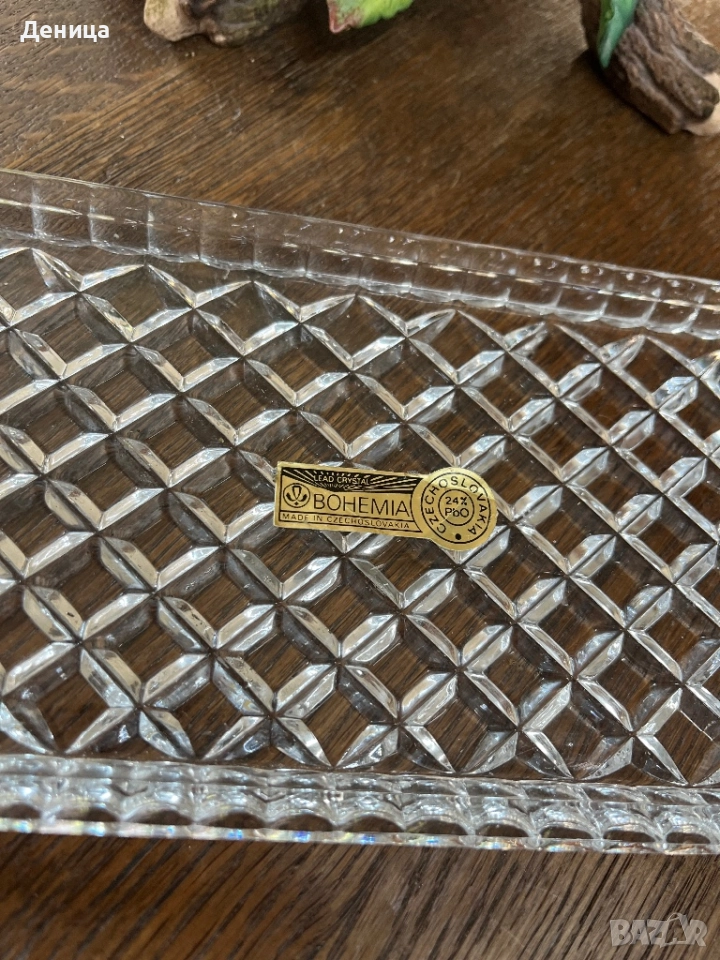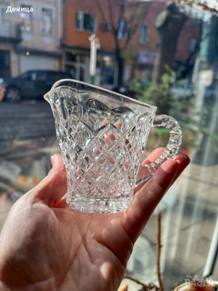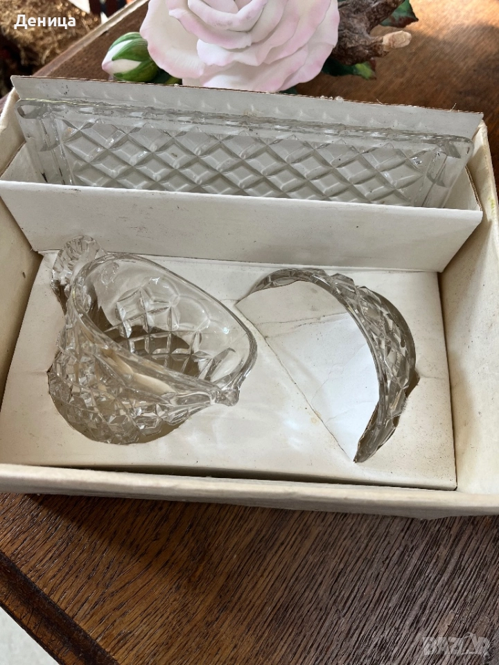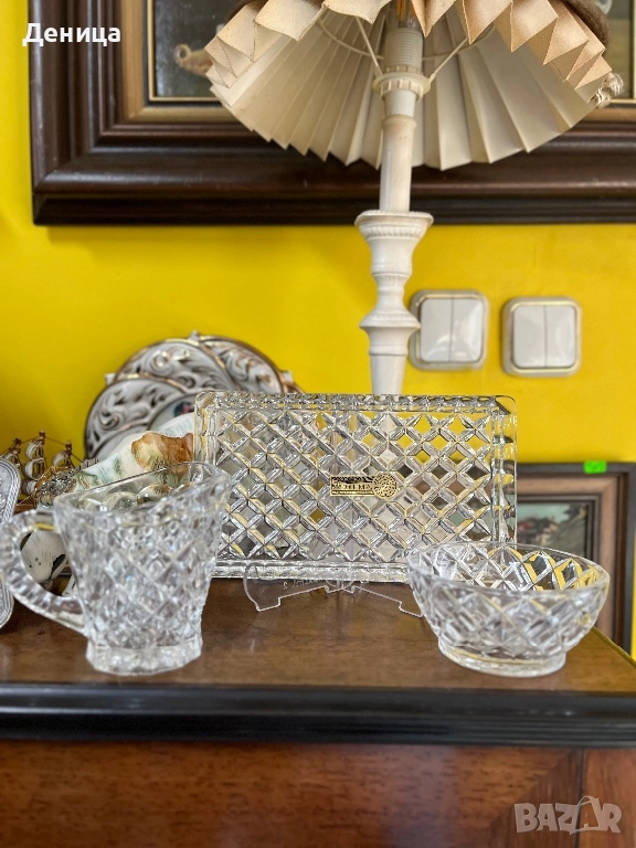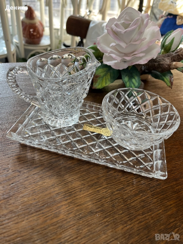 Бохемски кристален сервиз . Включва кана за сметана/ мляко, захарница и поднос. Отличителен диаман → Обява 52655735