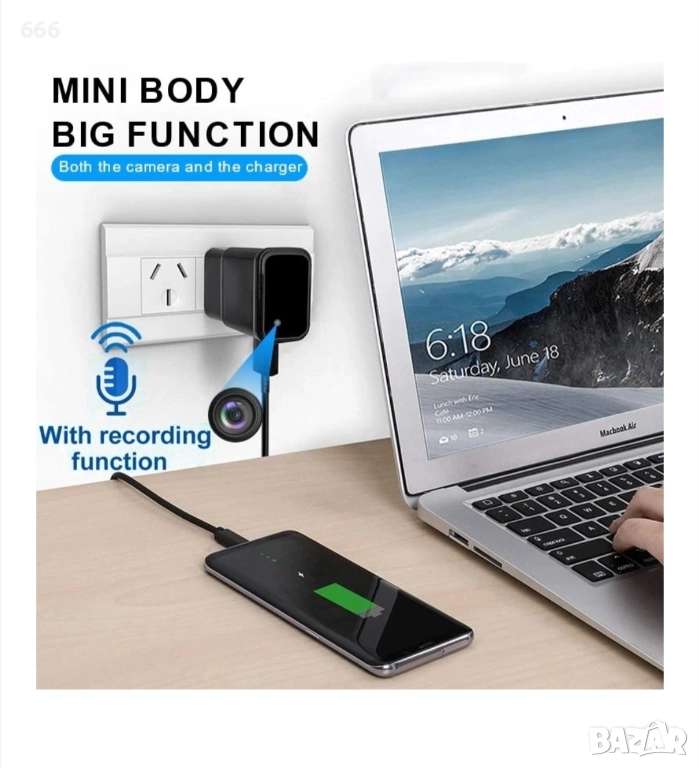 Можете да зареждате мобилния си телефон или други електронни устройства с помощта на USB адаптера за зареждане и едновременно с това да записвате видеоклипове. Тя не привлича внимание и не предизвиква подозрения. Позволява дискретно наблюдение.