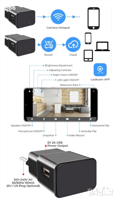 За да използвате Wi-Fi връзката, трябва да изтеглите приложението LookCam на смартфона си, което е налично в Google Play или App Store, и да настроите шпионската камера с Wi-Fi рутер (само 2,4 GHz). Сега вече сте готови да гледате LIVE видеоклипове от разстояние от вашия смартфон или таблет от всяка точка на света 24 часа в денонощието.
