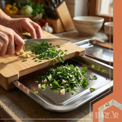 Тази бамбукова дъска за рязане с чекмеджета/контейнери прави готвенето по-бързо, организирано и чисто. Двата издърпващи се стоманени контейнера позволяват лесно отделяне на нарязаните продукти от отпадъците, а естественият бамбук осигурява здравина, устойчивост на влага и приятна визия. Идеална за всеки дом, професионална кухня или за подарък на любител готвач.