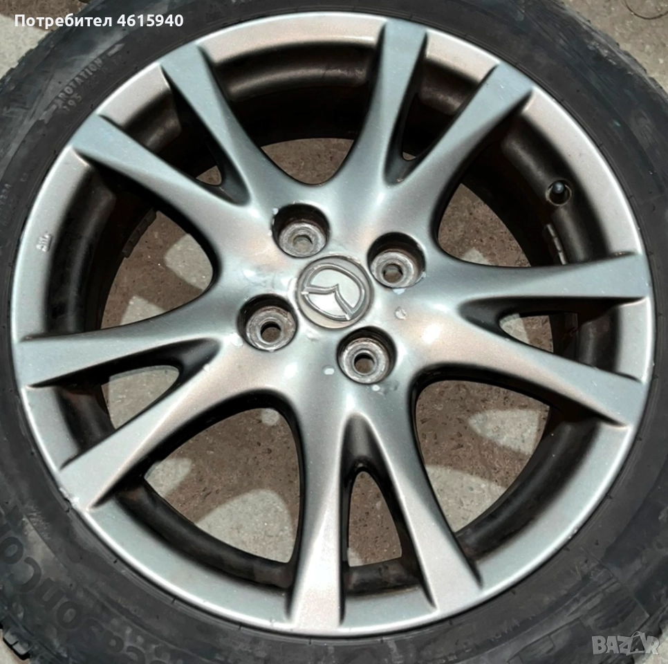 MAZDA МАЗДА 4бр оригинални алуминиеви джанти 16" с междуболтово разстоябние 4х100мм J6.5" ET50 централен отвор 54,1мм + 4бр всесезонни гуми 195/55/16 - 3бр континентал с равномерно износен грайфер над 6мм DOT 4218 и 1бр нексен над 7мм грайфер DOT 4522. Реални снимки. Налични козметични забележки , което е съобразено и в цената.