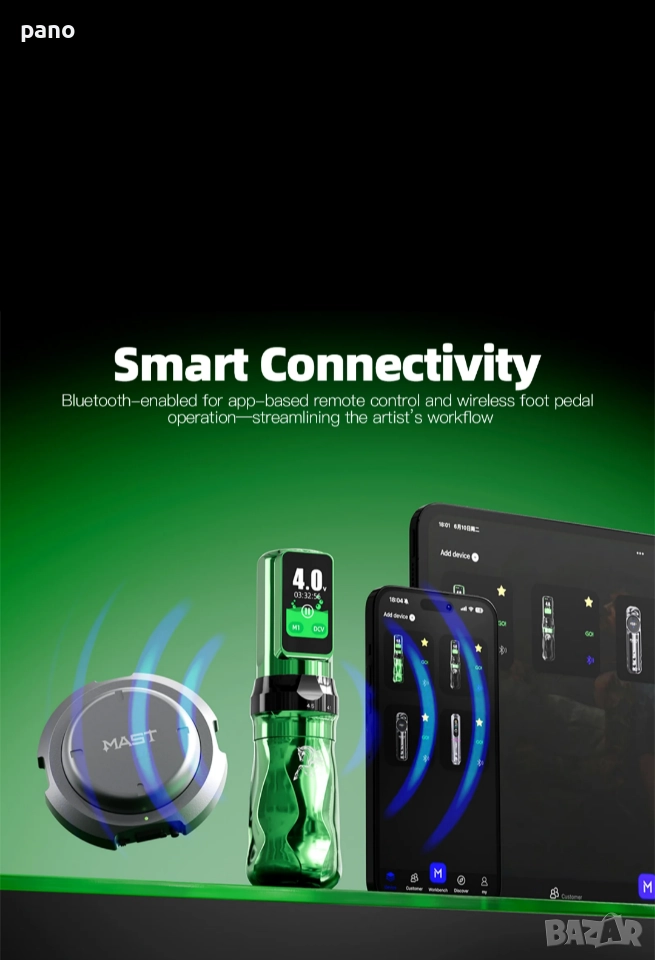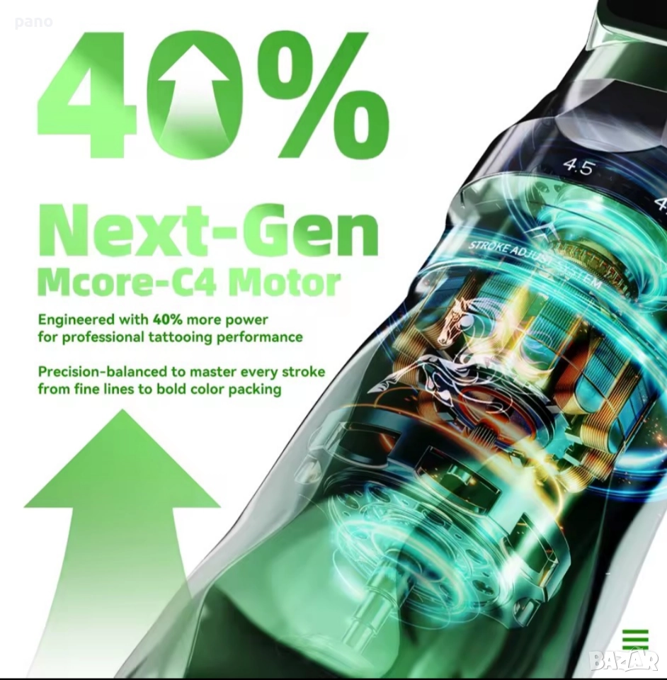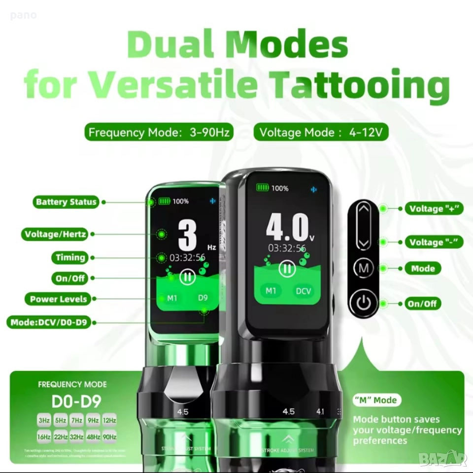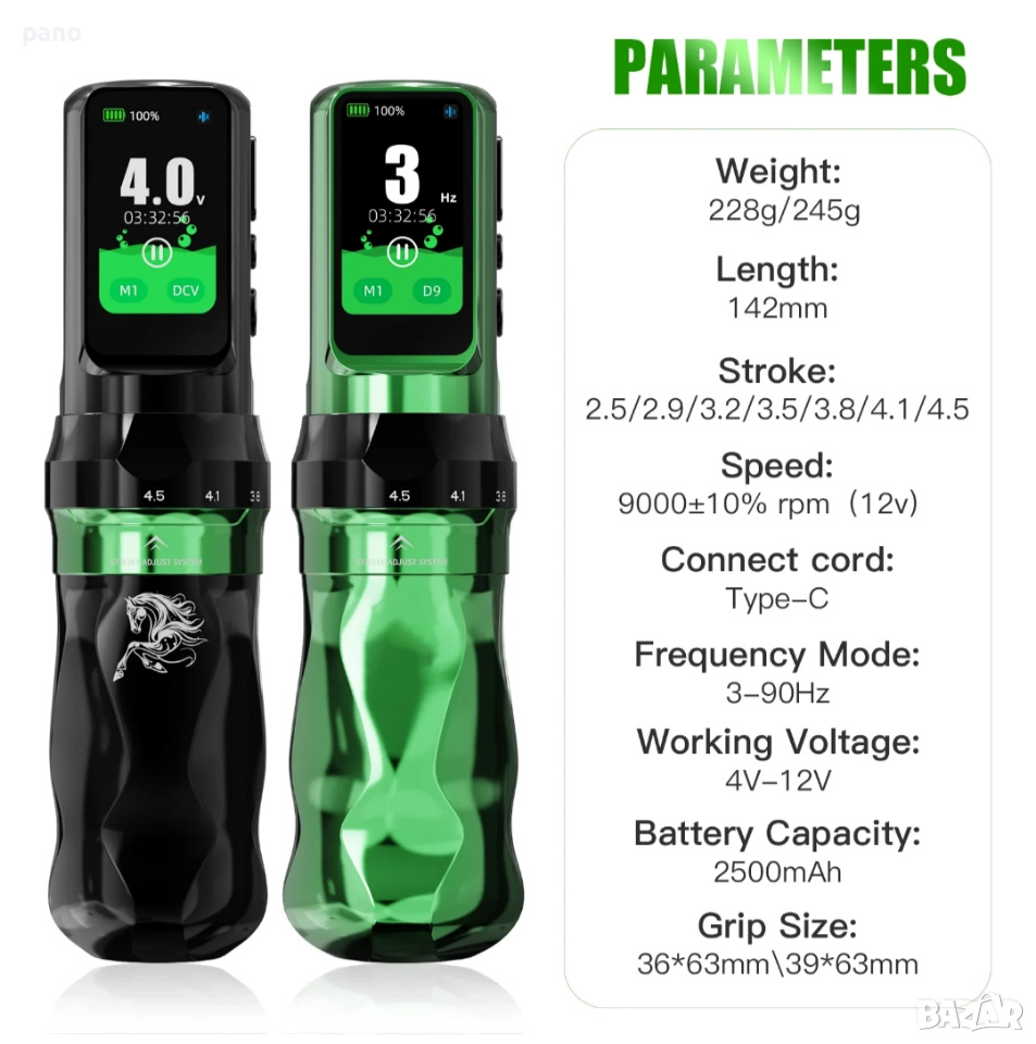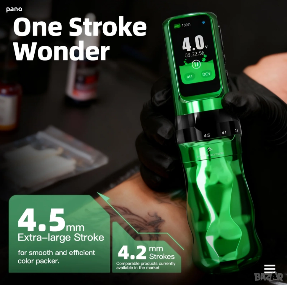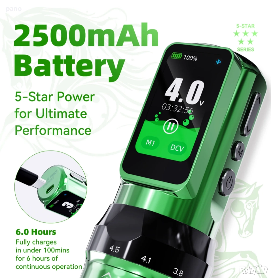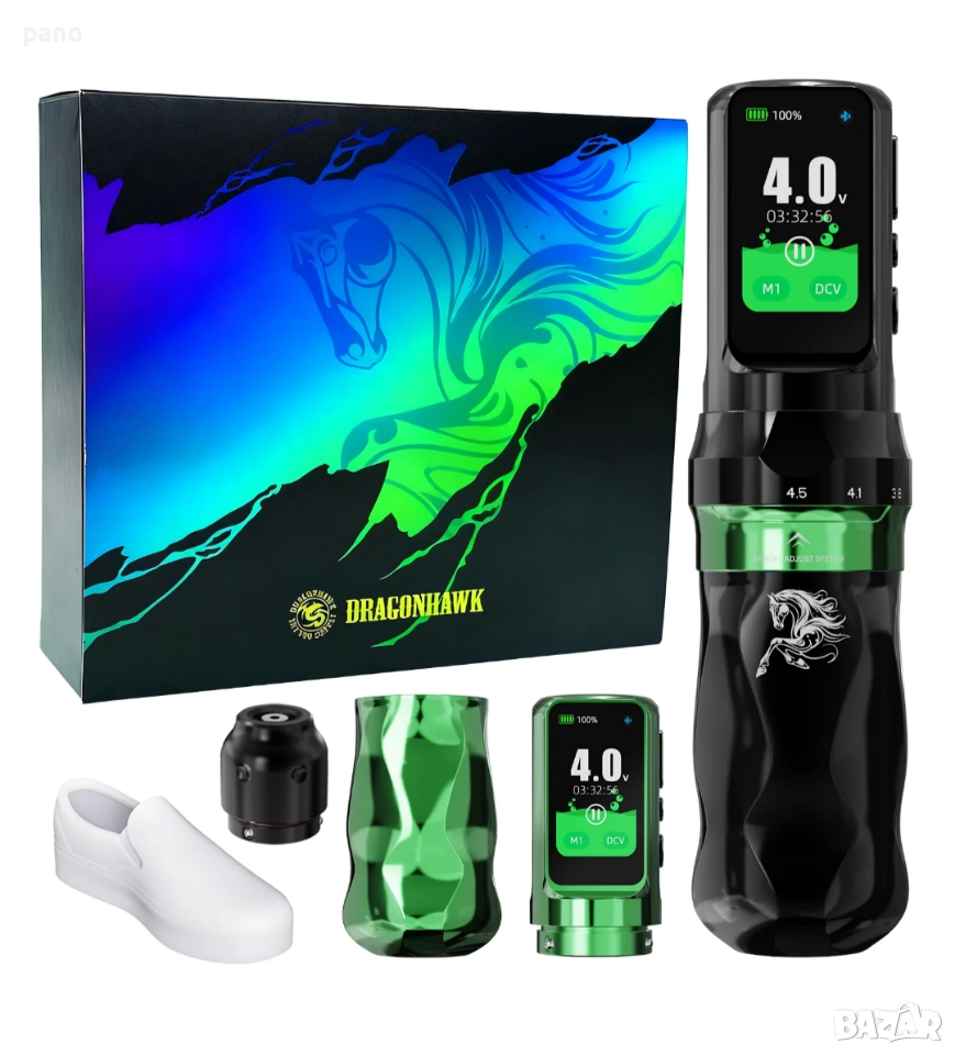 (Нова фабрично запечатана340€) Fold Pro (year of the horse edition). Машинка за татуиране, с две батерии, и две ръкохватки, в различни цветове. Комплекта включва- Втора батерия, втора ръкохватка (различни диаметри-36мм/39мм). РЦА адаптер, за свързване с траф или друга батерия, РЦА Кабел, 2х зареждащи кабели, и силиконова обувка за практика. Размери на машинката с батерия- височина 142мм, диаметър36/39мм, и тегло 245/228гр. Иновация при Регулиране на Строука от 2.5/2.9/3.2/3.5/3.8/4.1/4.5мм. Екстра дълъг строук! Капацитет на батериите 2500мАч. Издържаща 6-8 часа всяка, и време за зареждане 1.5 часа(ultra fast charging)+ 30% енергийна плътност. 5 звезди за върховна производителност. Ергономичен дизайн. Ново поколение Мощен Mcore С4 мотор, с до 40% повече мощност,(12v+-10%9000RPM). За професионално татуиране. Прецизно балансирана, за овладяване на всеки стил - от фини линии до наситено нанасяне на цветове. Памет на настройките M mode. Настройка за Дот. Работни честоти от 4-до12волт, и от3-до90херца. За всеки стил.(Портрети/реализъм/традиционни/ Цветен реализъм/и др.) Дисплей, (OLED) изобразяващ времетраене, %батерия,V/HZ, плей/пауза, и блутуут. Bluetooth възможност за свързване с други устройства, или безжичен педал, за традиционналистите. Последователна работа, от първата, до последната линия. Ниски нива на вибрация и шум. Professional's Choice. Facebook PANDA tattoo supply