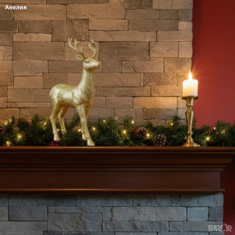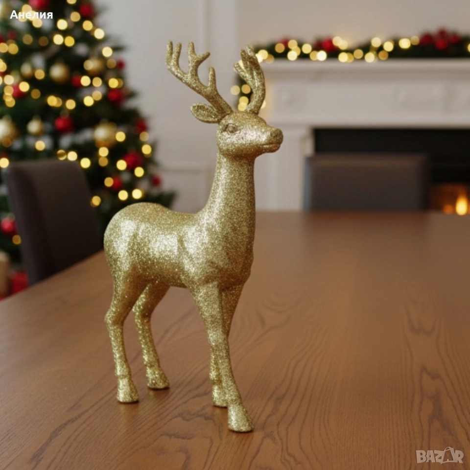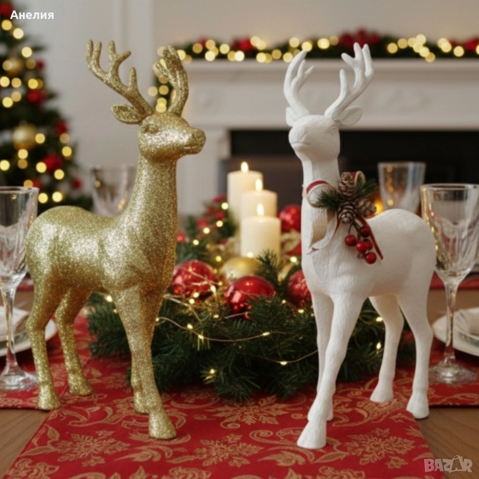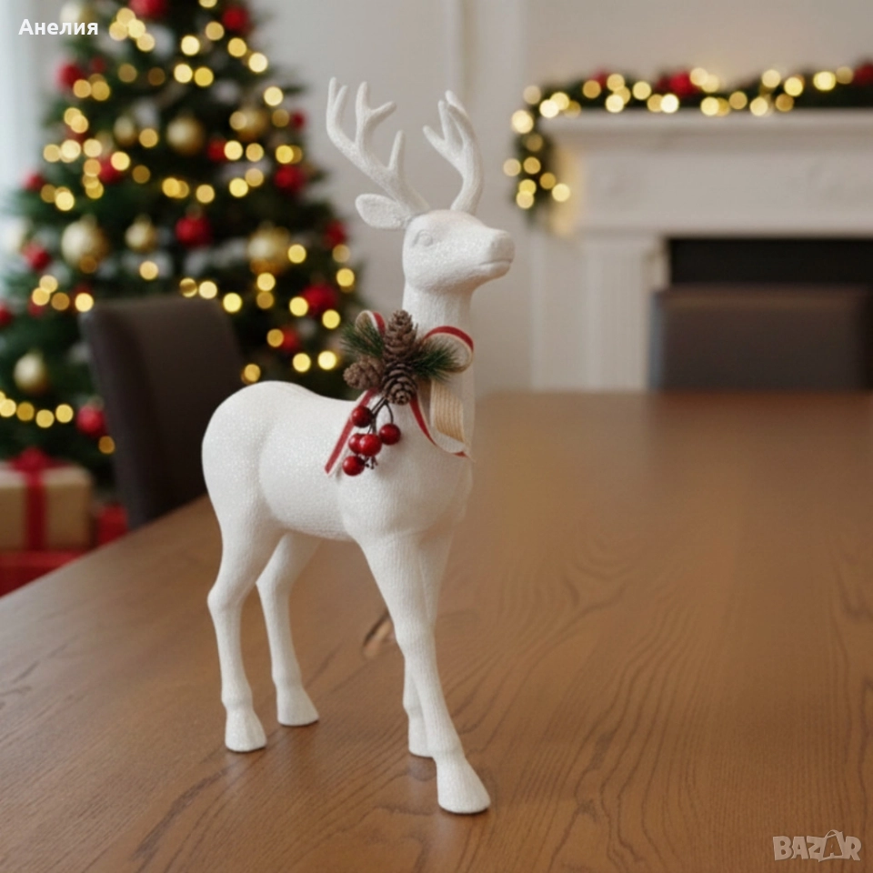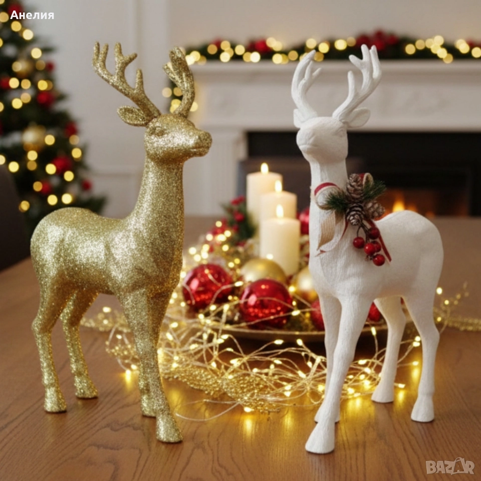Декоративен Коледен Елен – Златист или Бял, с Празнични Детайли.