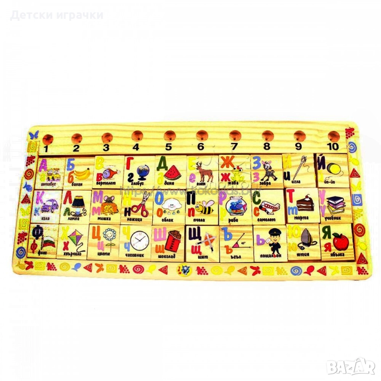30 броя квадратни кубчета, върху всяко от които има буква от българската азбука и картинка, започваща със съответната буква;