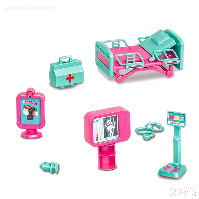 - Мини медицински аксесоари: комплект, стетоскоп - слушалки, диагностичен екран, мебели и др.