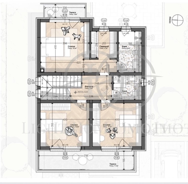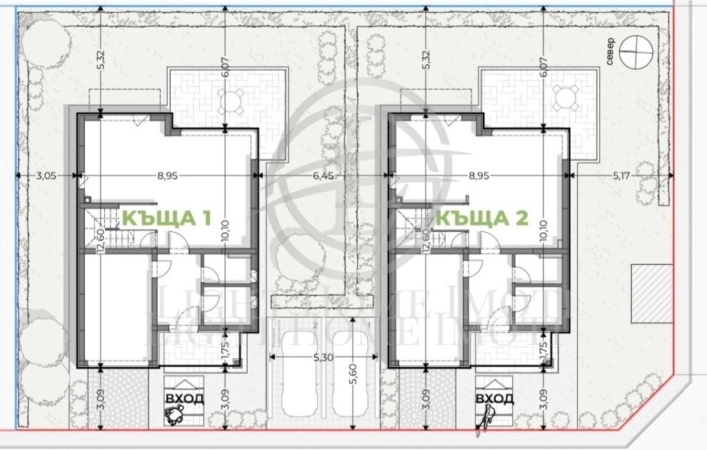 - Разпределение: 1 етаж: Просторна всекидневна с кухня, тоалетна, техническо помещение и склад, 2 етаж: три спални (едната от които със собствена баня с тоалетна и гардеробна), баня с тоалетна, коридор и две тераси