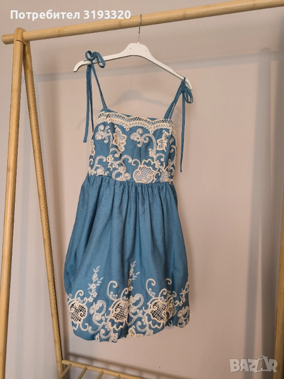 Красива дънкова рокля със Бродерик отговаря на размер S-M,нова с етикет,ако имате въпроси, пишете ми ще отговоря веднага.