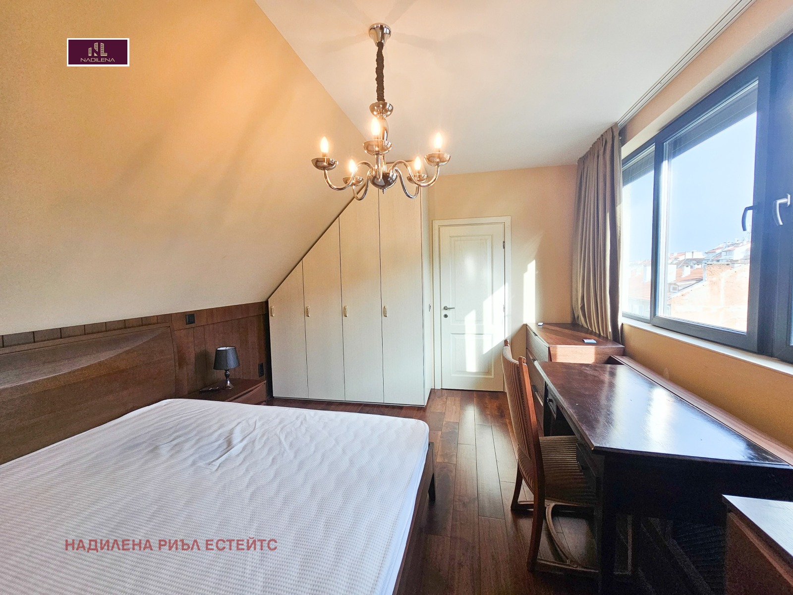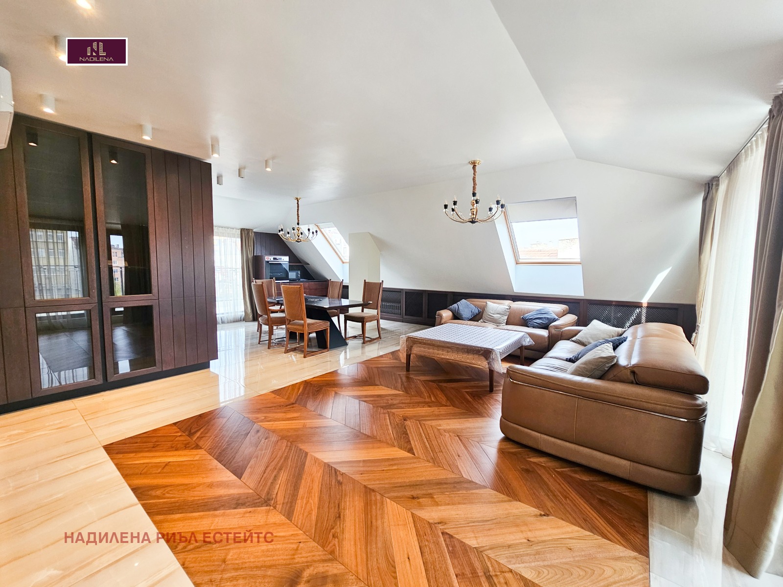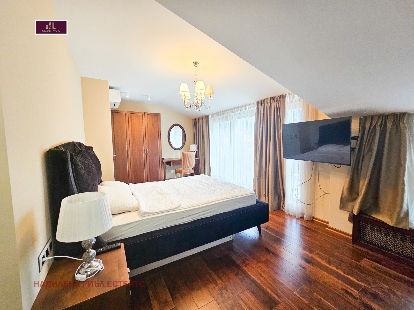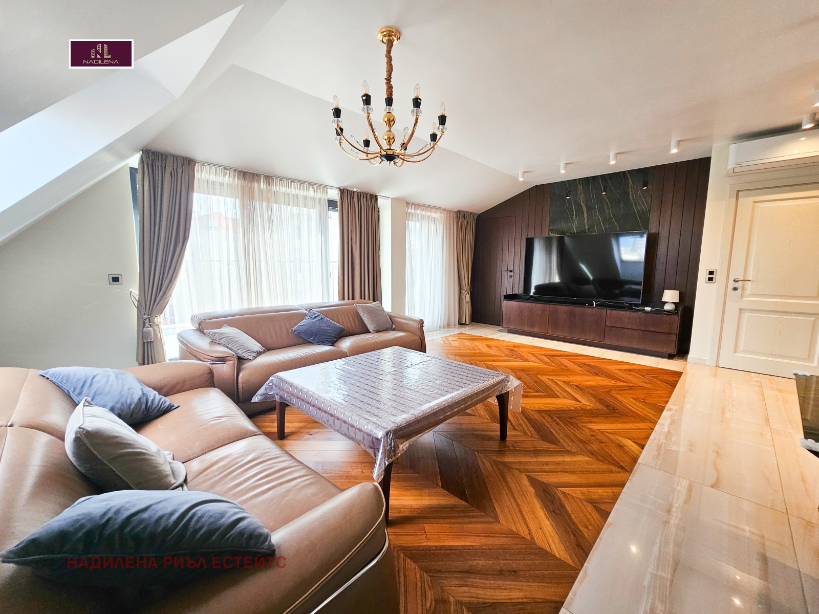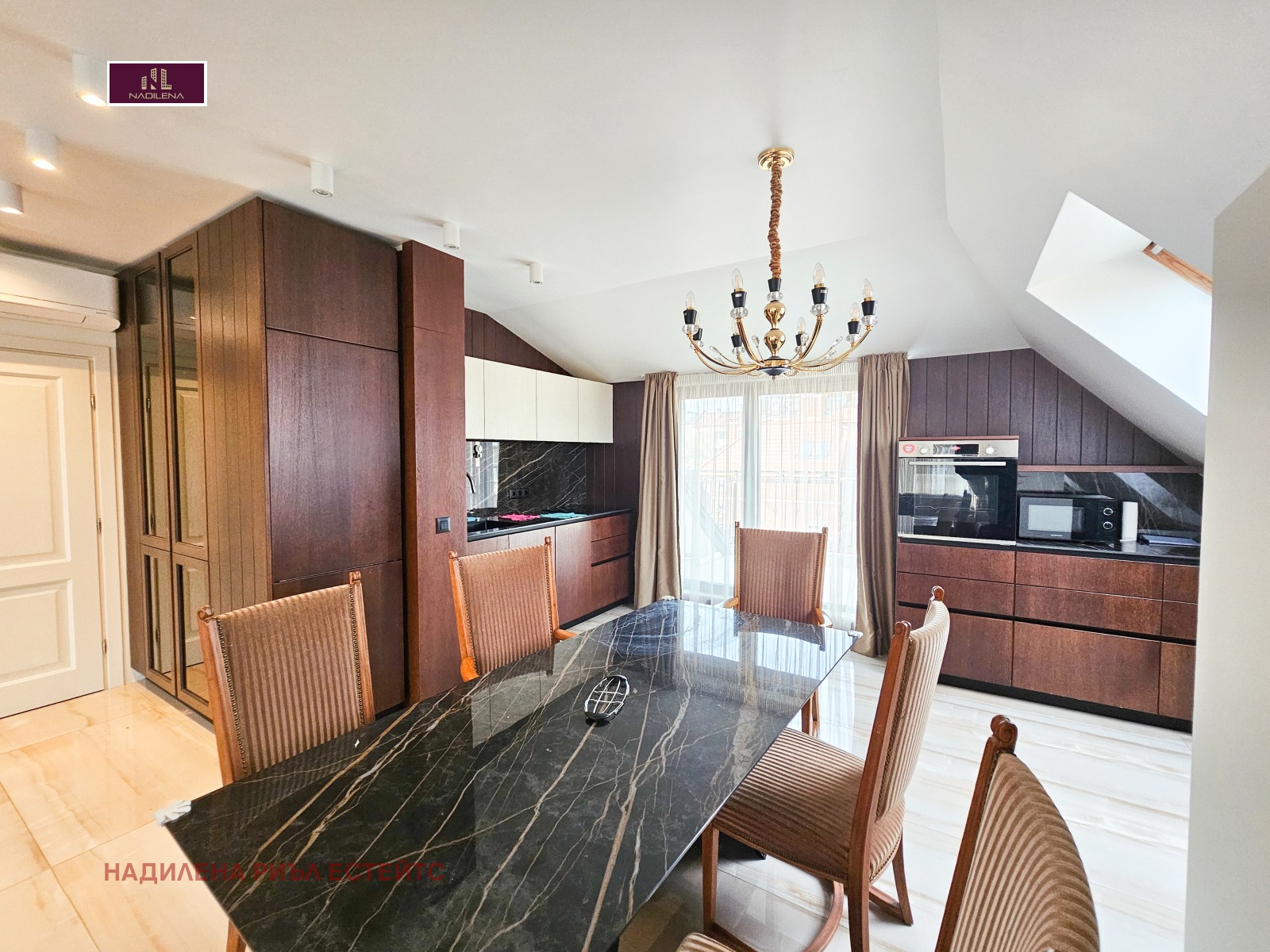 ДО ПЛ. РУСКИ ПАМЕТНИК! НОВА МОДЕРНА СГРАДА! С ГАРАЖ И ПАРКОМЯСТО! Надилена риъл естейтс предлага под наем изискан апартамент тип мезонет, с площ от 230кв.м., ет.5/от 6, с асансьор, отопление-ТЕЦ. Огромно предимство е отличната локация-улица 'Владайска', в близост до парк Възраждане, пл. Македония, МОЛ СОФИЯ, големи хипермаркети, заведения, държавни учреждения, банки, училища и детски градини. Сградата е нова строителство от 2019год., с контролиран достъп, видеонаблюдение, СОТ. Апартаментът е направен по индивидуален дизайнерски проект, използвани са качествени материали, мебелите са стилни и изчистени, осигуряващи пълен комфорт на живеене. Площта е разпределена на 2 нива и включва на 1-во ниво-антре с вграден гардероб, спалня с излаз на тераса, втора спалня със самостоятелна баня с тоалетна излаз на тераса, мокро с пералня и отделно сушилня, просторна дневна с трапезария, вградена кухня с висок клас електроуреди, излаз на два балкона, 2-ра баня с тоалетна, килер. На второто ниво самостоятелна спалня с гардероб и бюро, голяма баня с тоалетна. Настилката в коридора е гранитогрес, дневната и стаите са на скъп естествен паркет. Във всяко помещение за охлаждане и в преходните сезони за отопление са поставени климатици. Изложение-изток/запад/север. Навсякъде има поставени и автоматични ролетни щори. От всички тераси се открояват панорамни гледки. Към апартамента има гараж и паркомясто ВКЛЮЧЕНИ В ЦЕНАТА! БЕЗ ДОМАШНИ ЛЮБИМЦИ. За допълнителна информация и огледи се обръщайте към Надя Антова-088/9999 413, 0888/788 420, Васил-0899/18 35 80, Елена-0898/60 55 33