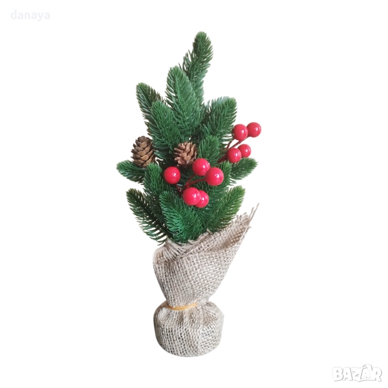 Декоративна мини коледна елха в чувалче, мини елхичка за украса, коледен декор с шишарки и червени плодчета – идеална за дом, офис и подарък