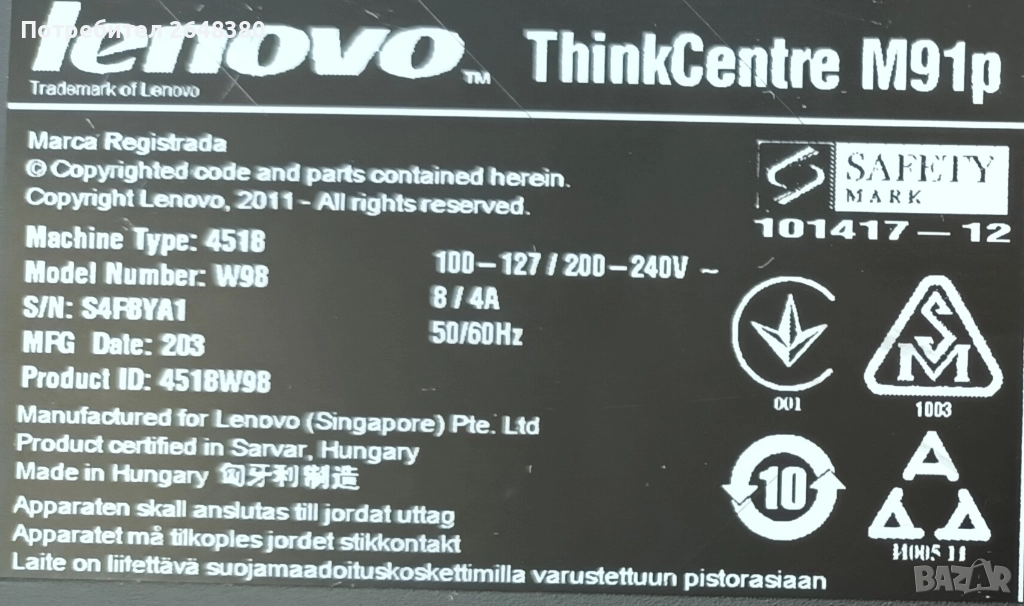 Компютърна конфигурация - Lenovo ThinkCentre M91p SFF