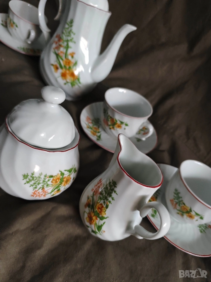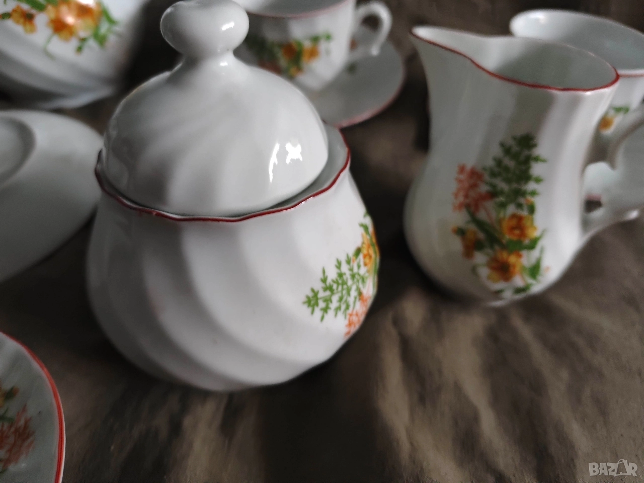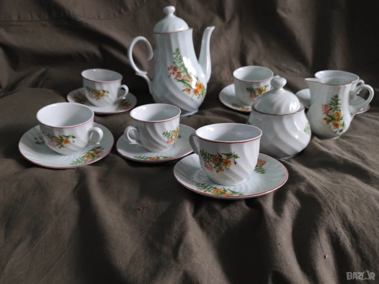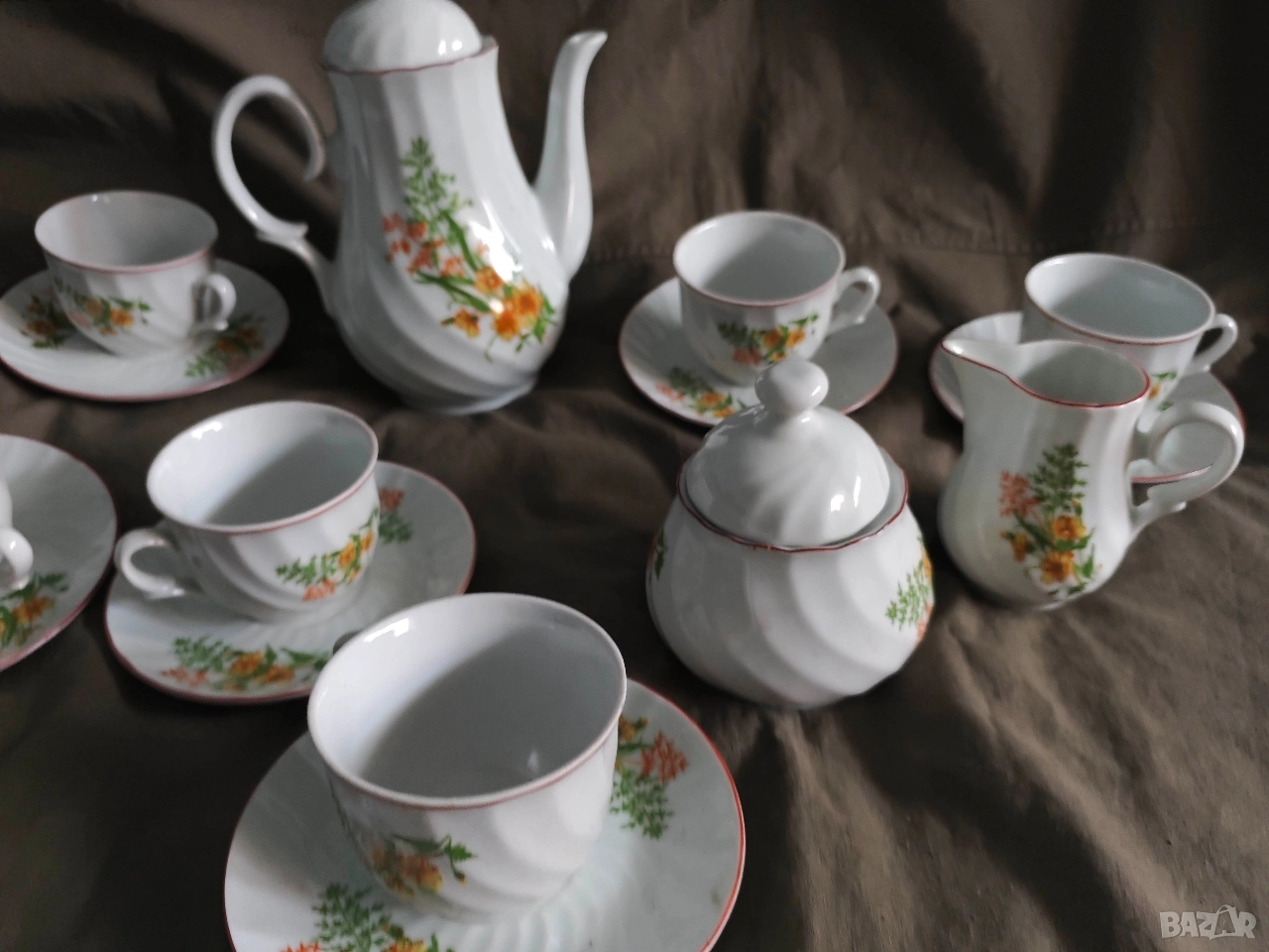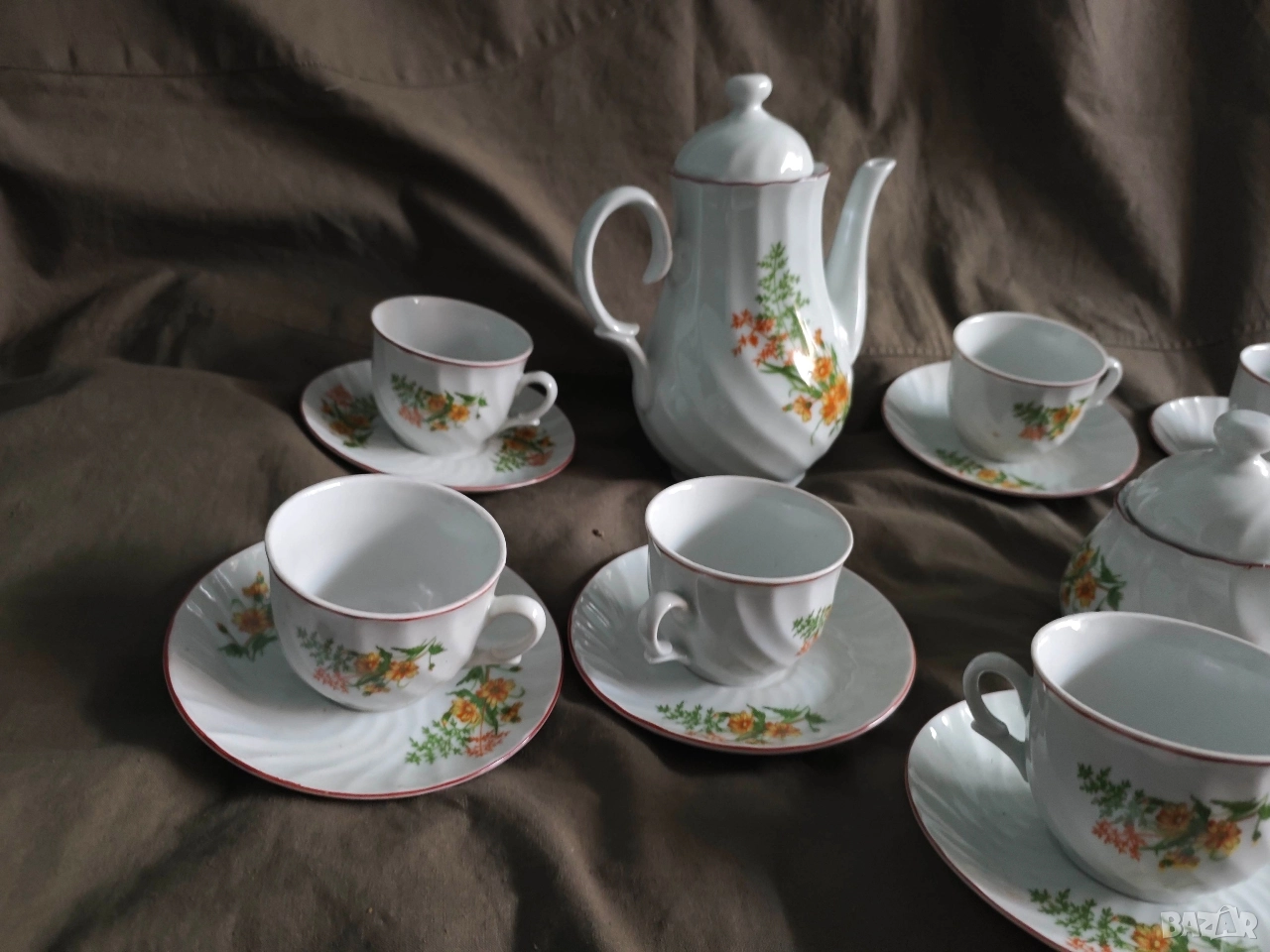 Нов порцеланов сервиз за чай или кафе .Състои се от 6 бр. чашки , 6 бр. чинийки , голяма кана с капаче , малка кана и захарница с капаче.Производител завод "Китка - Нови пазар" , 80-те години. Нов не е използван никога