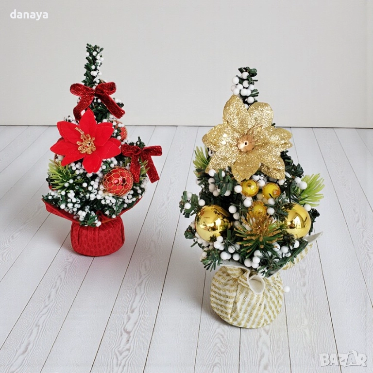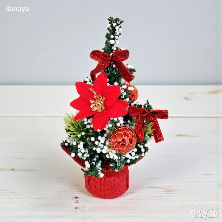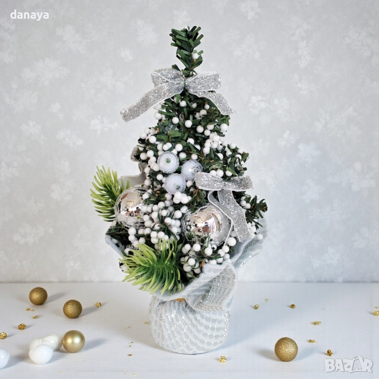 Реалистичните клончета, комбинирани с бели декоративни „снежни“ зрънца и елегантни орнаменти в червено, златно или сребристо, придават завършена, стилна празнична визия. Чувалчето в основата осигурява стабилност и добавя топъл, натурален чар. Отличен избор за тези, които търсят красива, компактна и готова за поставяне коледна украса без поддръжка.