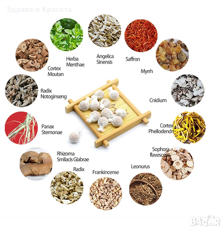 Състав: Съдържа десетки натурални компоненти, сред които: сок от драконово дърво, люляк, борнейски камфор, анжелика, танинова акация и други билки, използвани в традиционната китайска и тибетска медицина.
