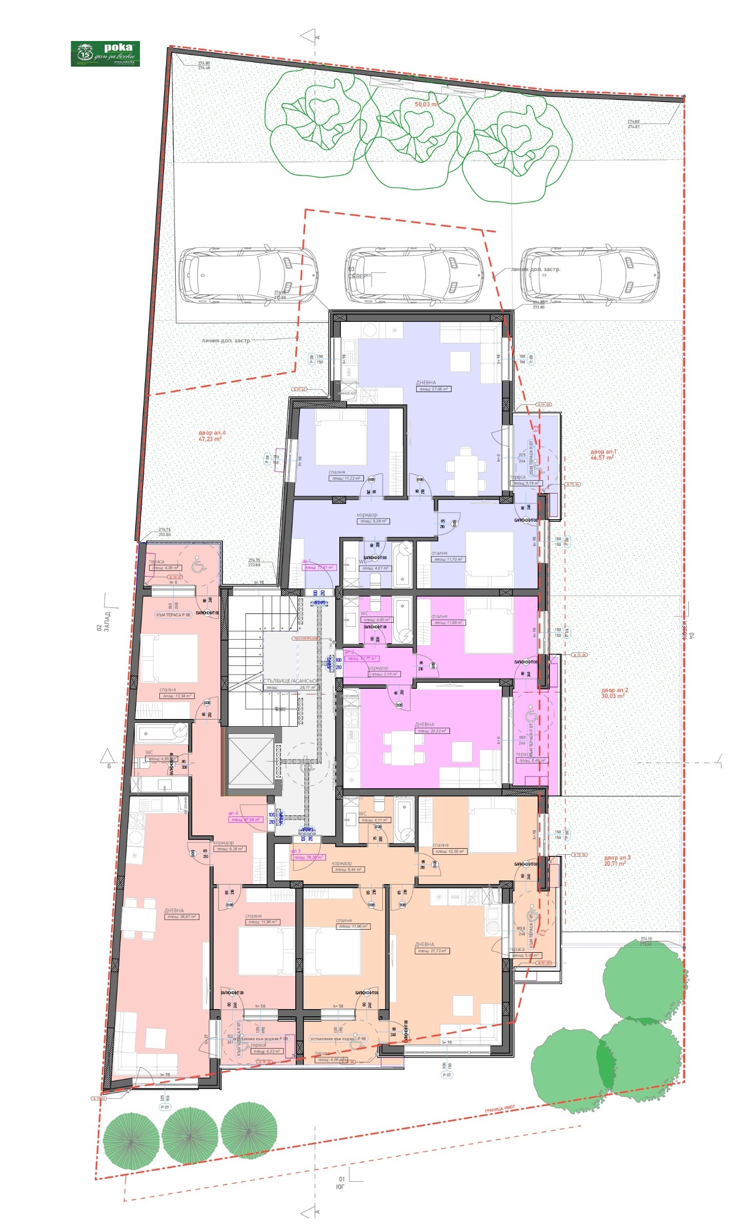 - Разпределение: двустайни и тристайни апартаменти със складови помещения, а строителят е предвидил и възможност за отделно закупуване на гараж