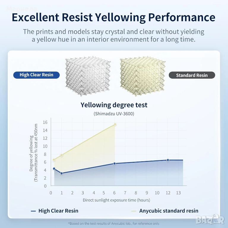 ANYCUBIC High Clear 3D Printer Resin има отлична устойчивост на пожълтяване. Въпреки времето разпечатките и моделите остават кристално чисти и ясни, без жълтеникав оттенък. За да осигурите изключителна яснота и прозрачност на моделите, моля, спазвайте препоръчителните параметри за печат, за да нулирате времето за експозиция на светлината.