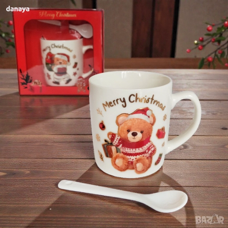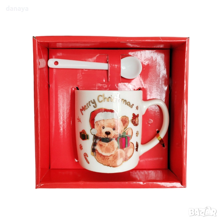Коледна чаша Merry Christmas с мече и лъжичка, подаръчен комплект в кутия – идеален коледен подарък за деца и възрастни.
