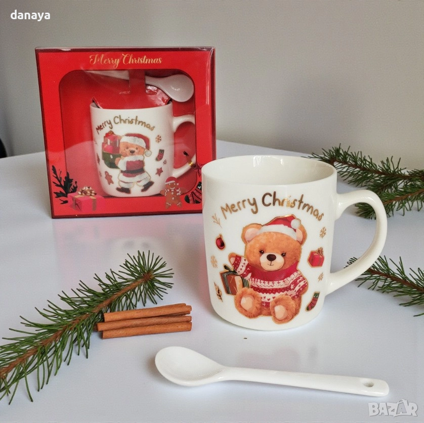 Коледна чаша Merry Christmas с мече и лъжичка в красив подаръчен комплект, подходяща за топли напитки и за всякакъв коледен повод. Този комплект е практичен, ефектен и готов за подаряване – идеален избор, когато търсите красив, достъпен и смислен коледен подарък за дете, приятел, колега или член на семейството.