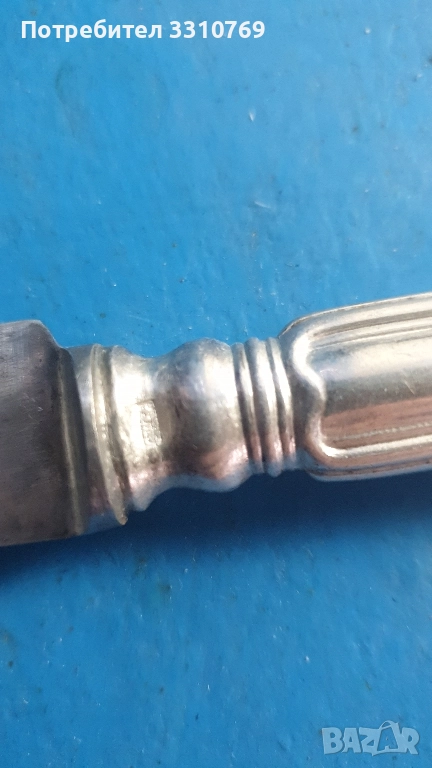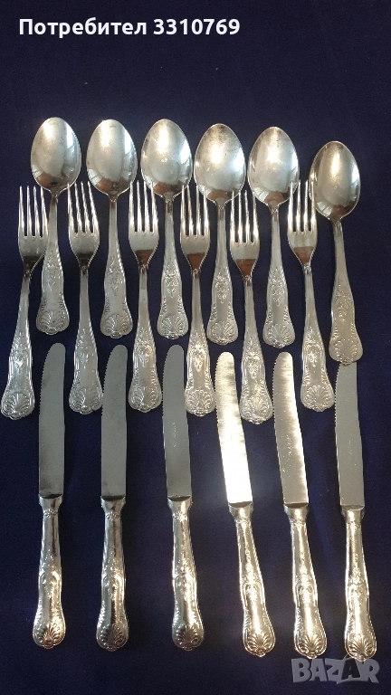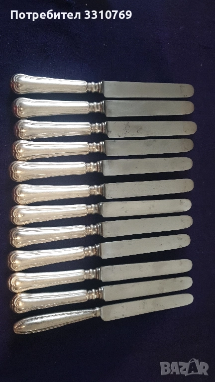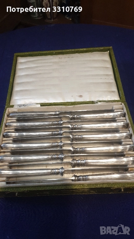 Снимка7-коплект прибори за хранене,лъжици дължинаД=20см.,вилици Д=20см.,ножове Д=23см цена Ц=270лв. Снимка8-печат(глиган АР=АRGENT PLATED=посребрено). Снимка 9- комплект посребрени прибори за сервиране, черпак-31см., вилица-22,5см.,шпатула- 24см.,щипка-21,5см. печат (АР). Снимка10-комплект ножове за хранене в специален калъф, дължина 22см.,12 броя, цена 120лв.печат(+W).За ценители на красотата на редки антикварни художествени изделия!
