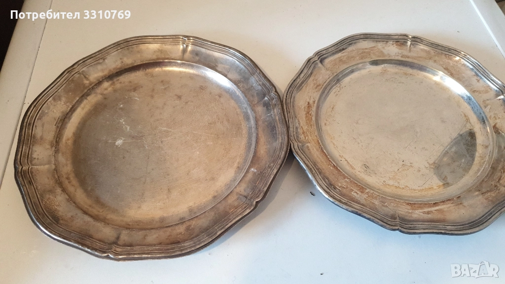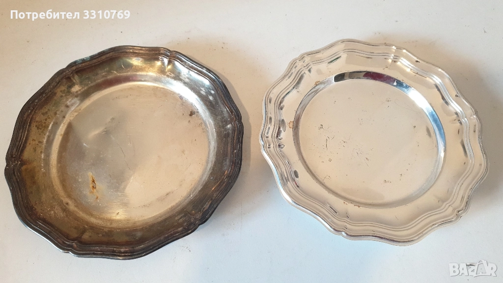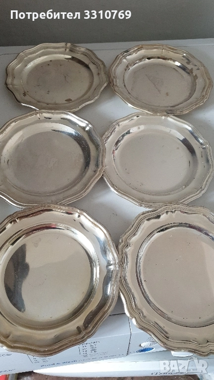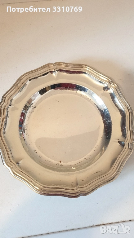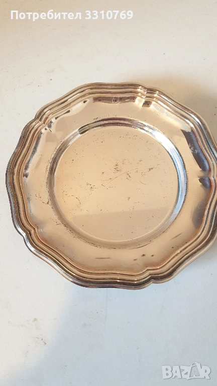 Д=22см.Ц=20лв. Снимка16:Чиния4-плато,посребрен Д=22,5см.Ц=30лв.-2броя. Снимка17:Чиния5-посребрени,десертни Д=16см.,Ц=20лв.,за 2 броя. . Снимка17:Чиния6- посребрени, десертни Д=15см.Ц=20лв.за 2 бр. Снимка18:Чиния1-посребрена,десертна, Д=12,5см.Ц=10лв.