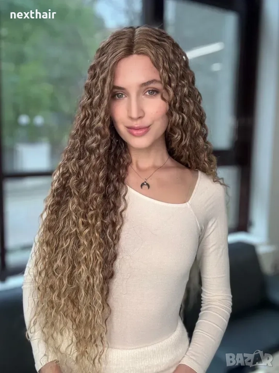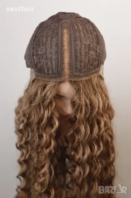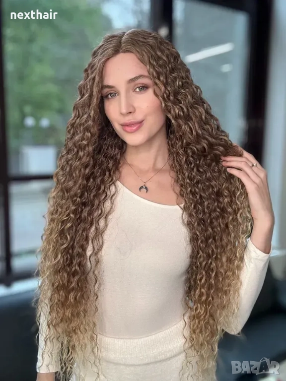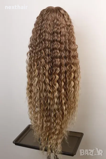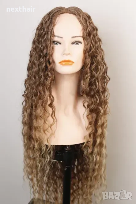 Омбре къдрици 80 см - кафява перука с реалистичен път 13x4x1