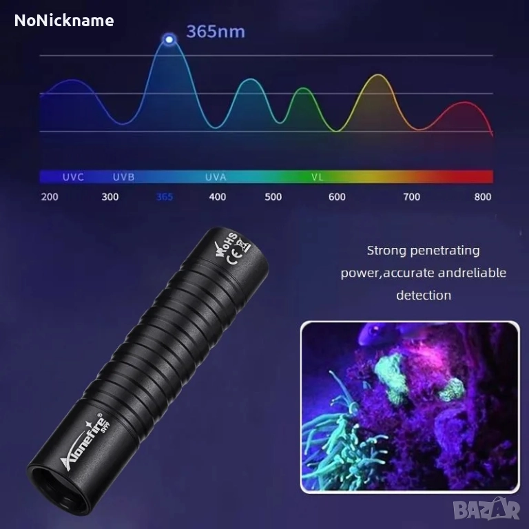 • Ултравиолетовата светлина с дължина на вълната 365 nm е невидима с просто око, така че не е толкова ЯРКА, колкото фенерчето с дължина на вълната 395 nm, но е по-перфектна за откриване на силно засичани вещества, като флуоресцентни агенти и код за сигурност. 365 nm UV е истинският специализиран спектър за откриване. Може да се използва при естествена светлина и се представя по-добре на тъмно с малко изтичане на видима светлина.