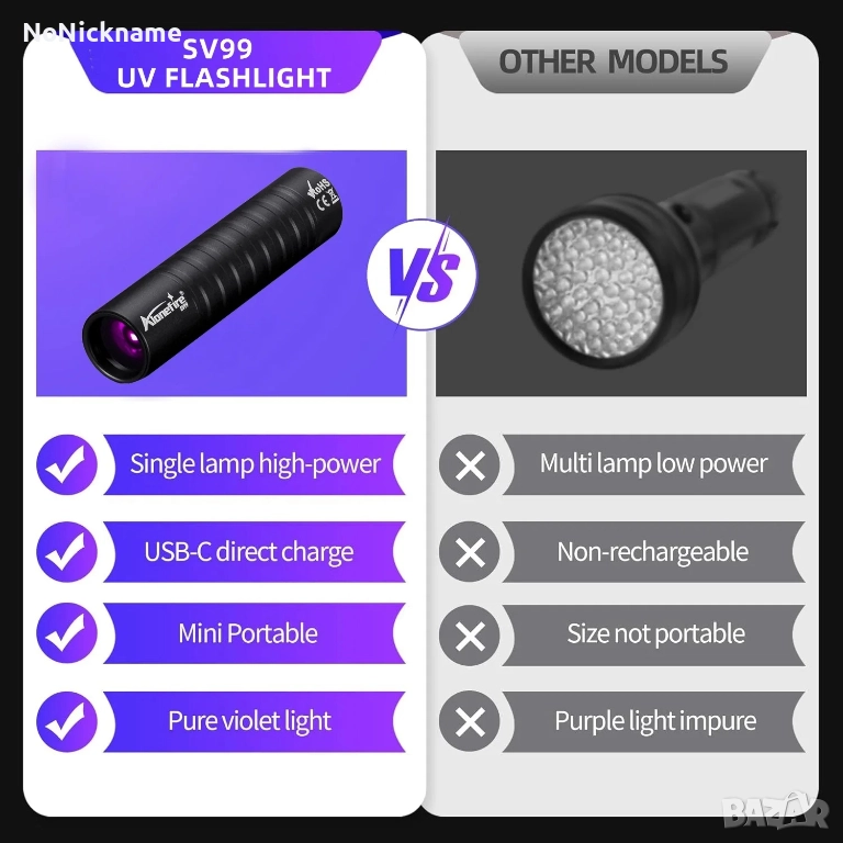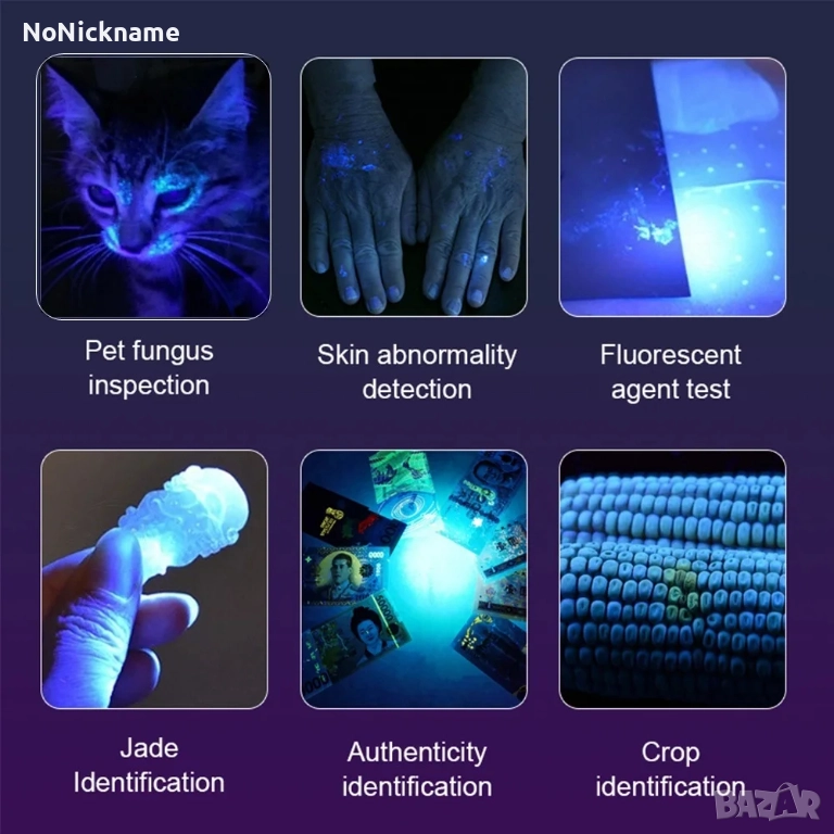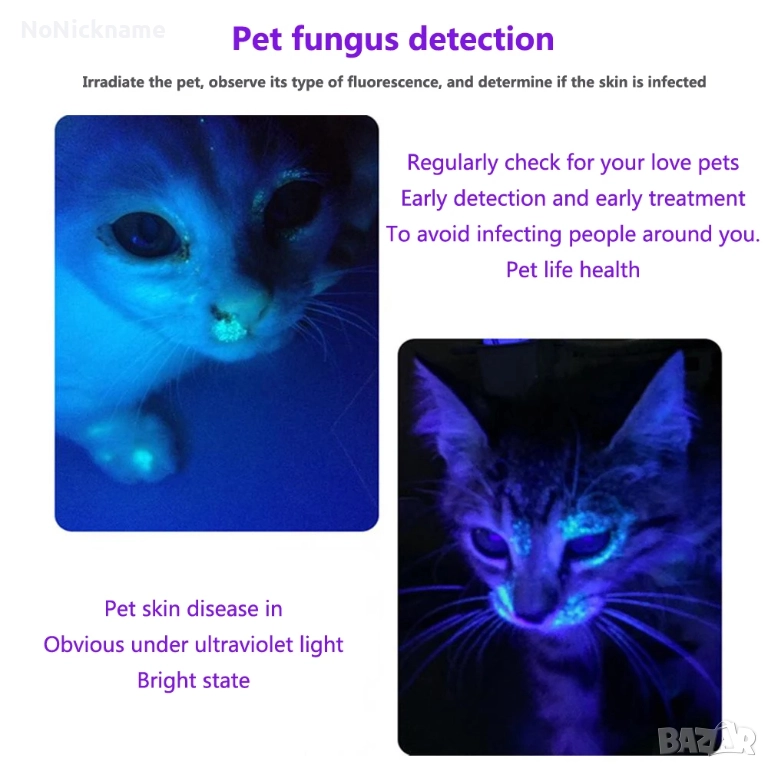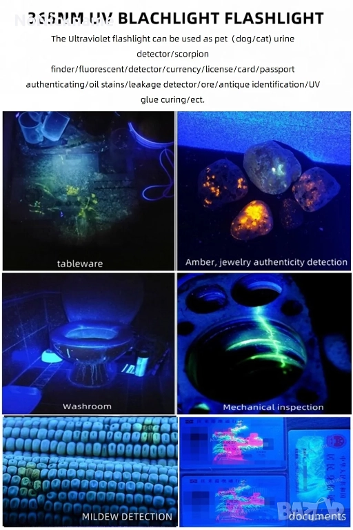 • Може да се използва като детектор за урина / детектор за скорпиони / флуоресцентен детектор / детектор за удостоверяване на пари / лиценз / карта / паспорт / детектор за маслени петна / детектор за течове / руда и др. за домашни любимци (кучета/котки).