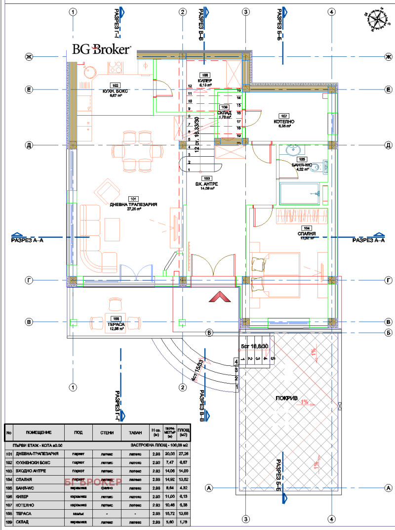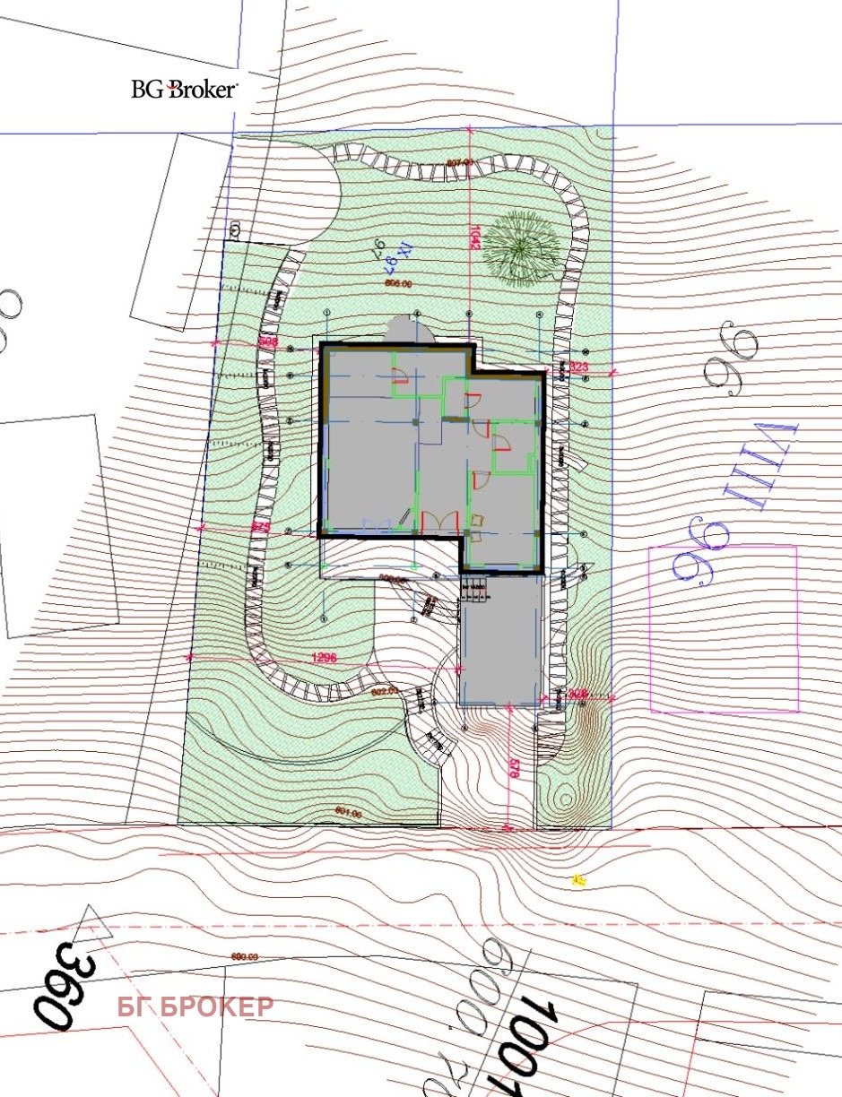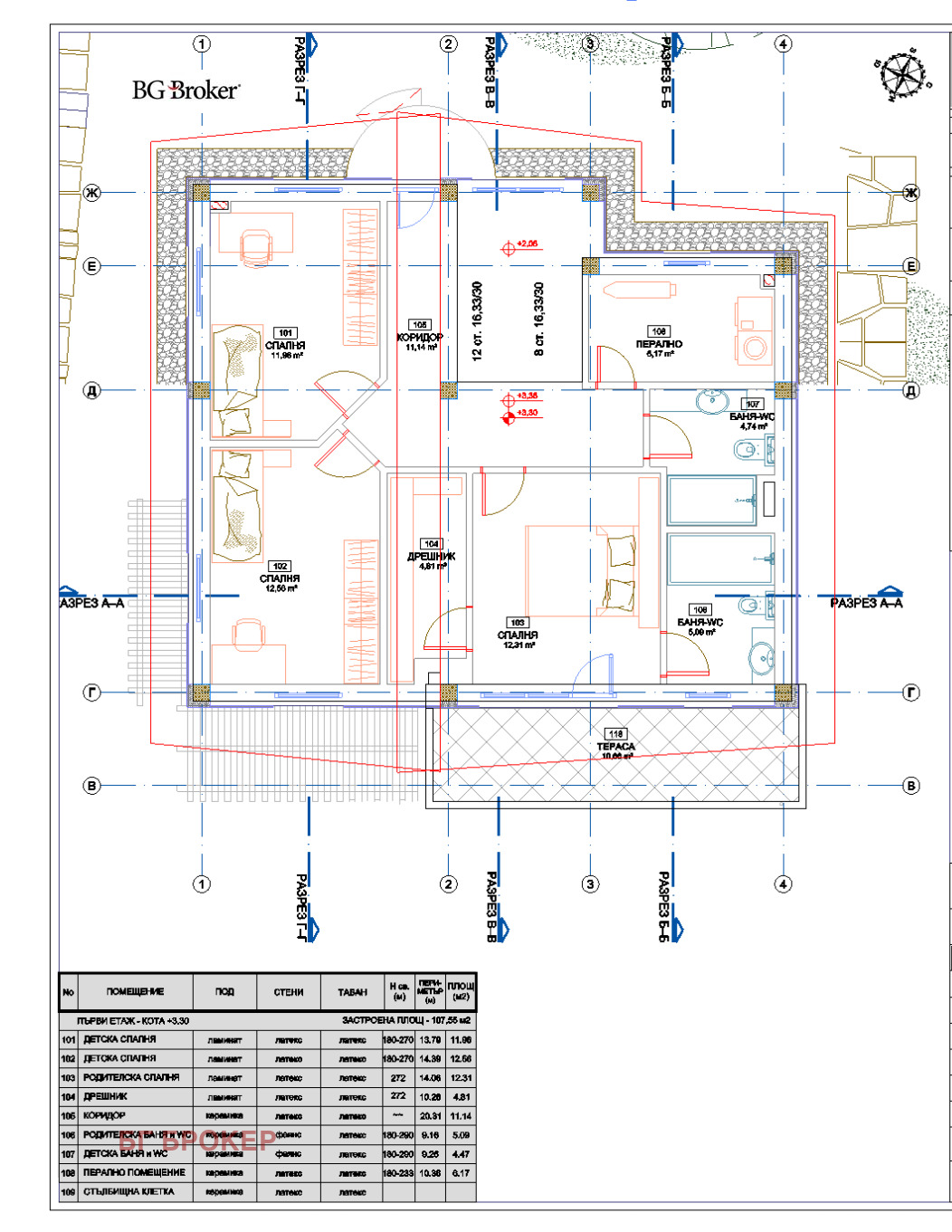 - Етаж 2: три спални, две бани с тоалетни /една към спалня/, склад/перално и две тераси.
