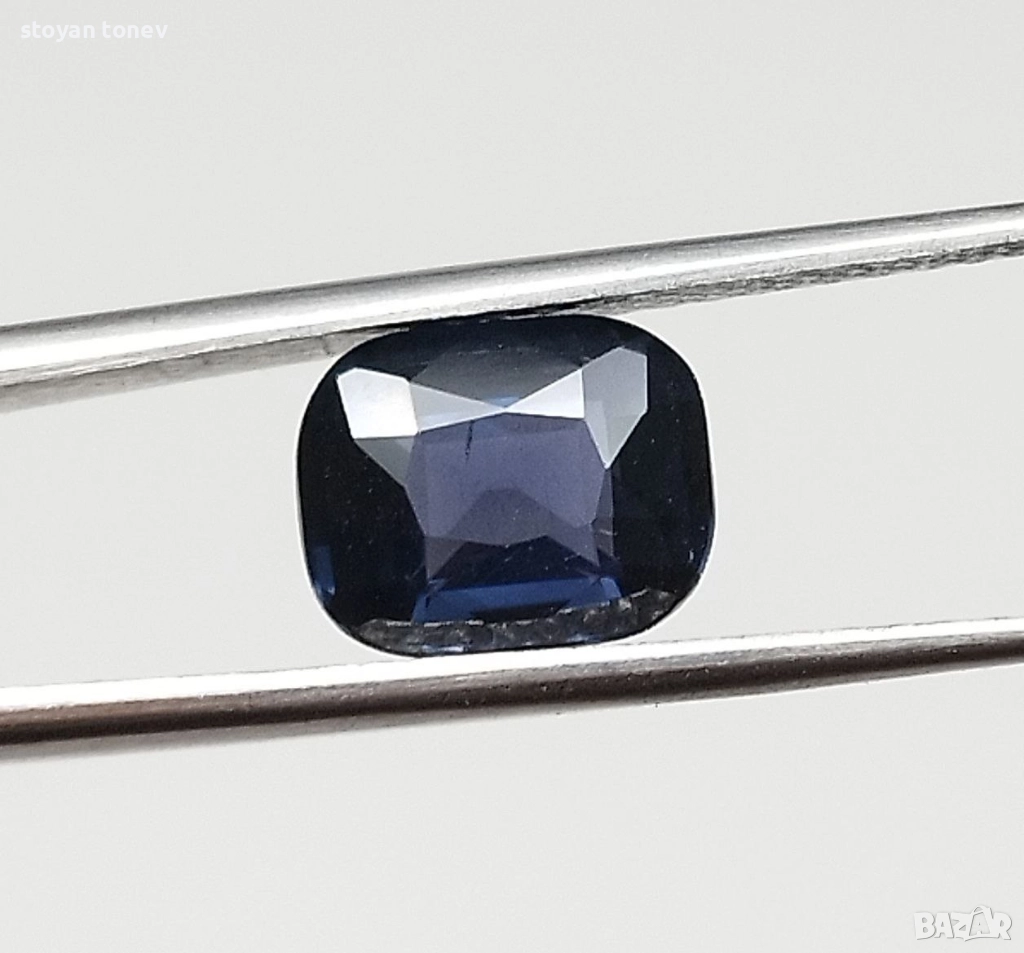 с без видими включения. Цвета е син. Формата е къшън с размери: 7.85 x 6.05 x 4.05 mm.