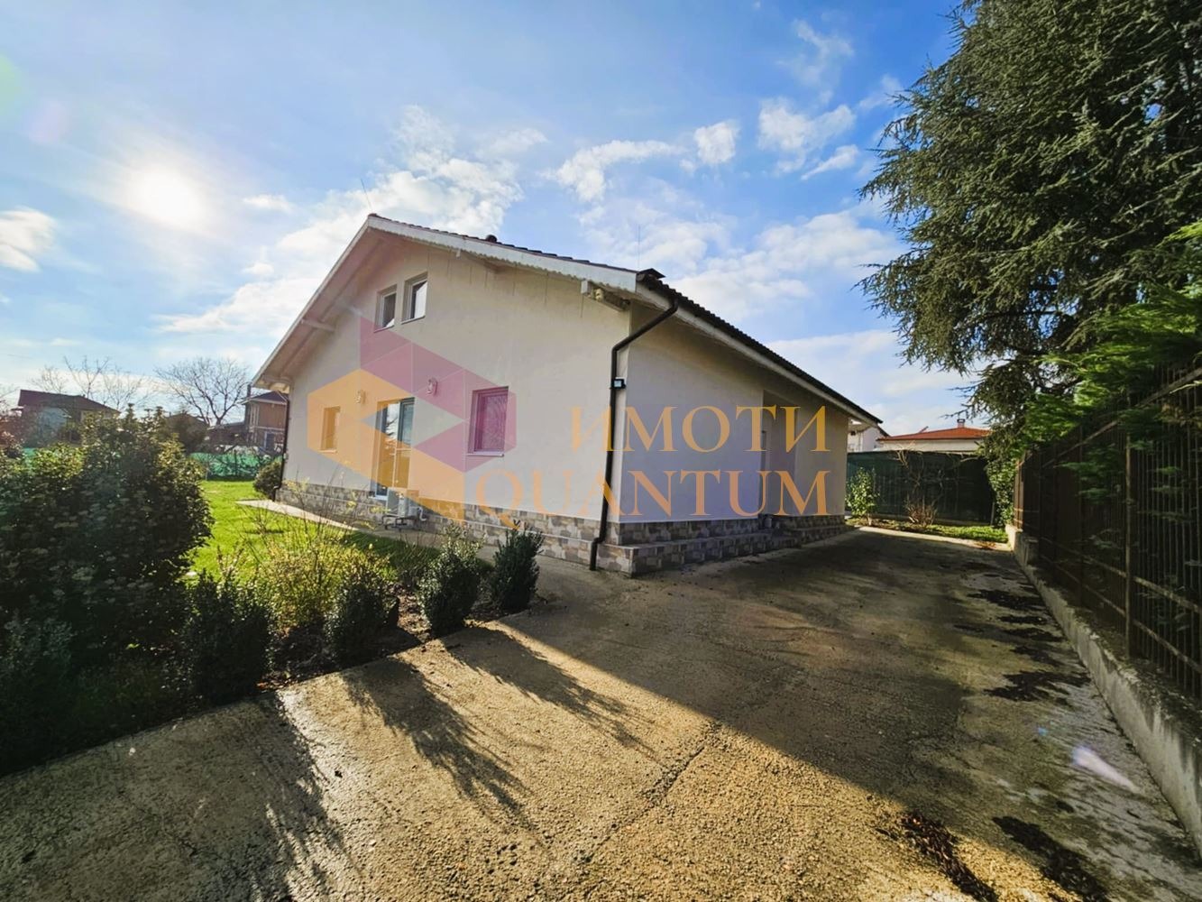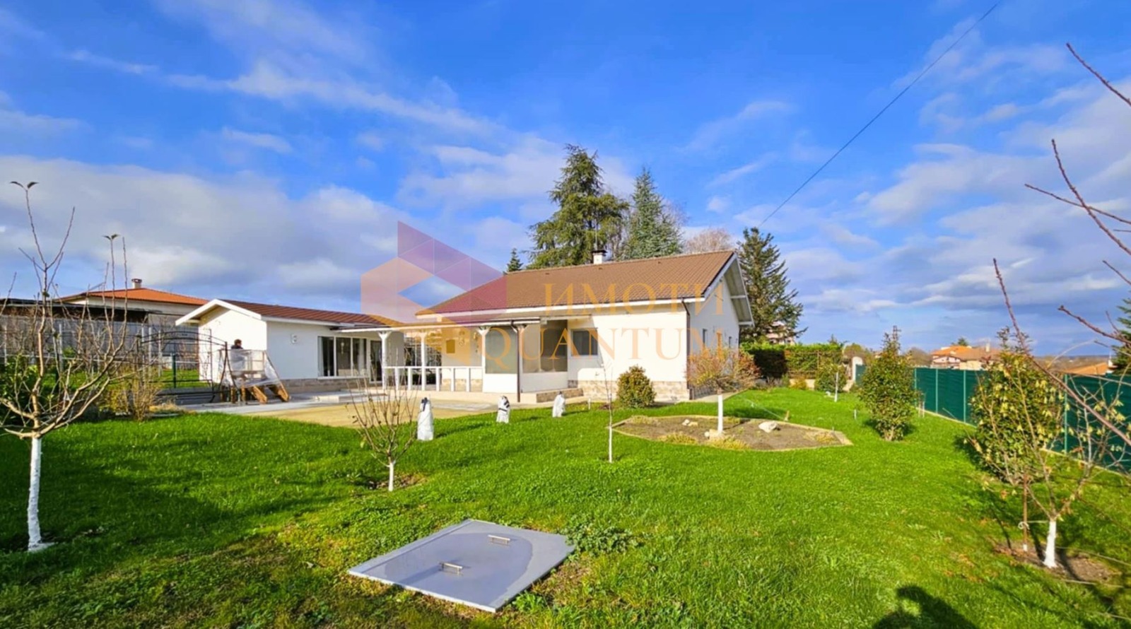 Дворното място е оформено красиво с райграс, овощни дръвчета, декоративни храсти и др.
