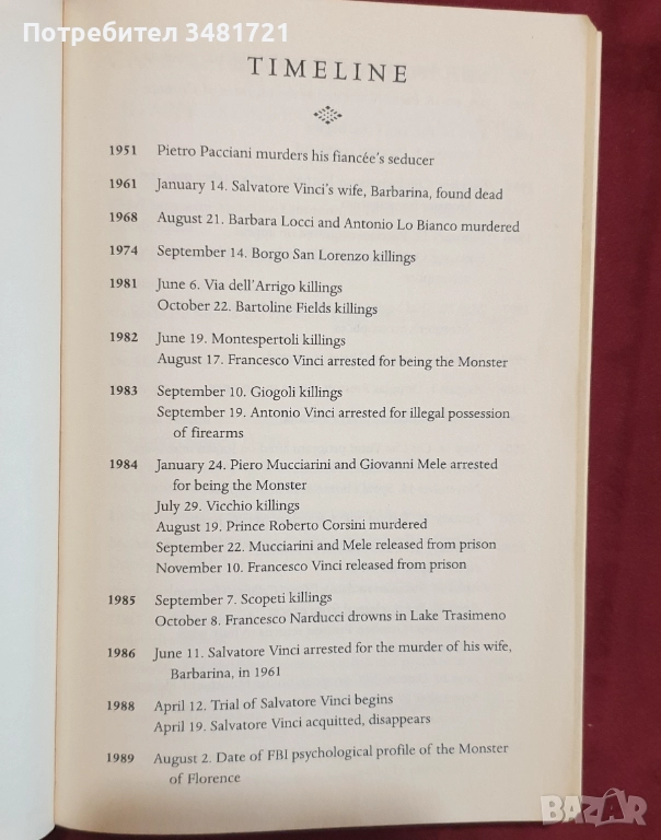 Всичко това се променя, когато открива, че прекрасната маслинова горичка пред къщата им е била сцена на най-скандалните двойни убийства в италианската история, извършени от сериен убиец, известен само като Чудовището от Флоренция. Заинтригуван, Престън се присъединява към бившия италиански разследващ журналист Марио Специ, за да разрешат случая.