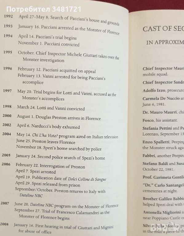 След това, по странен обрат на съдбата, самите Престън и Специ стават обект на полицейското разследване на убийствата. Телефонът на Престън е подслушван и е разпитван от полицията, обвинен в лъжесвидетелстване, подхвърляне на фалшиви доказателства и съучастие в убийство - и му е наредено да напусне страната. Съдбата на Специ е дори по-лоша: той е хвърлен в мрачния италиански затвор Капане, обвинен, че самият той е всъщност Чудовището от Флоренция.