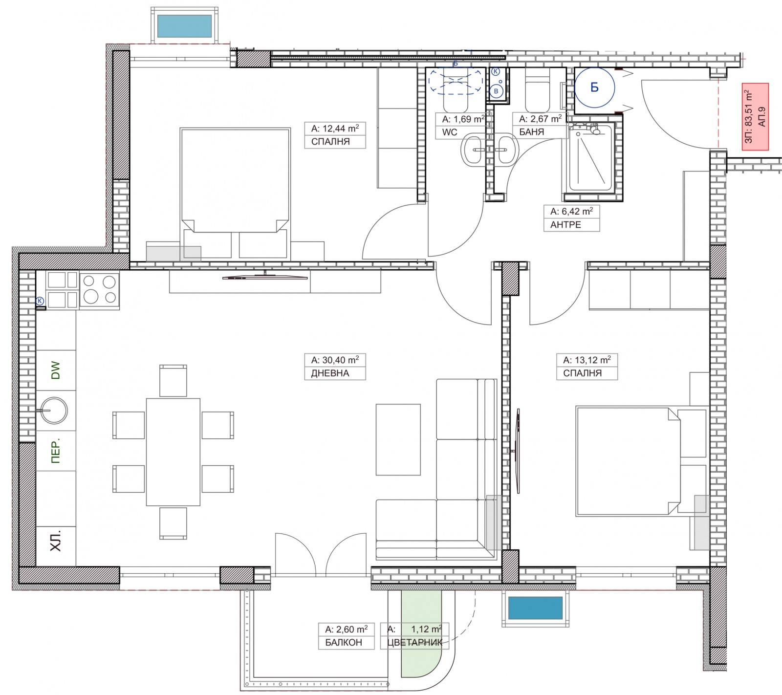 СВЕТЛИ ( чисти) площи на помещенията, измерени без стени!