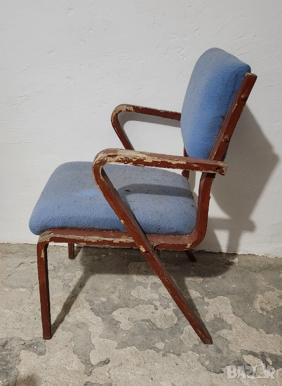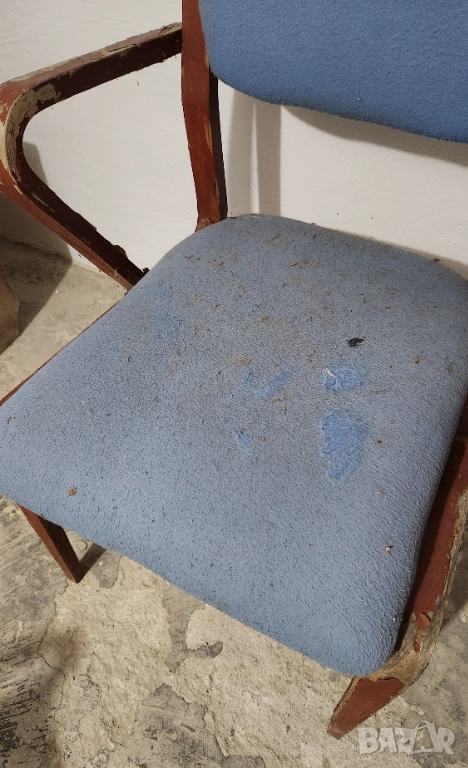 Продавам винтидж стол с интересен дизайн и дървена конструкция. Седалката и облегалката са тапицирани в светлосин плат. Столът е стабилен, но има следи от употреба – тапицерията е захабена и на места има петна, а по дървените части има обелвания на лака/боята. Подходящ е за реставрация, ремонт или като декор за интериор с винтидж визия.