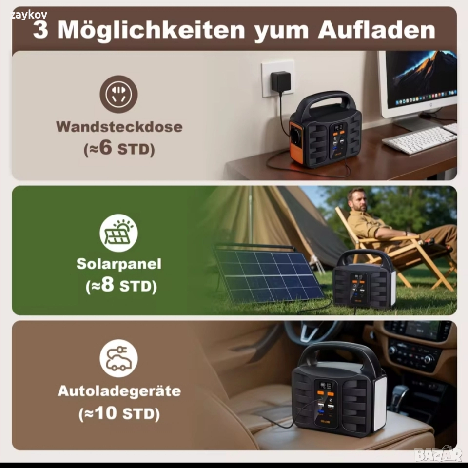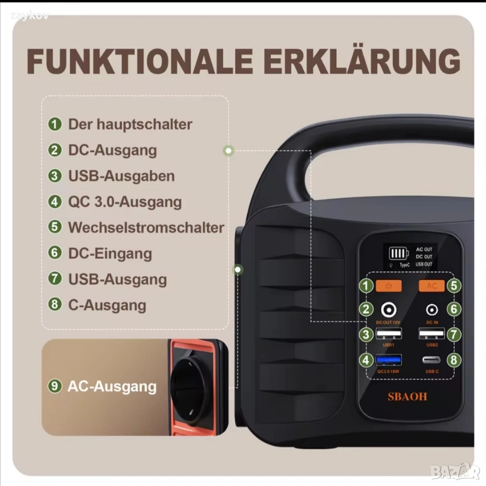 MPPT ТЕХНОЛОГИЯ】Преносимото захранване SBAOH има вградена MPPT технология, която може да се зарежда ефективно чрез слънчеви панели. Просто свържете изходния порт на слънчевия панел към входния порт на продукта (Забележка: напрежението в режим на празен ход на слънчевия товар трябва да е по-малко от 28V, максималната поддържана мощност за зареждане на слънчевия панел е 150W). 【ПРЕНОСИМА ЕЛЕКТРОСТАНЦИЯ】Camping Powerbank е компактна и преносима електроцентрала, създадена за приключения на открито. Независимо дали сте на къмпинг, туризъм, шофиране или разходка с лодка, Power Generator осигурява надеждна работа, която ще ви отведе на вашето приключение навсякъде. [CLIMAR SAFE NEUTRAL] В сравнение с традиционните генератори, SBAOH Powerstation е по-екологична и не изисква бензин или друго гориво. Интегриран соларен контролер за зареждане с MPPT технология помага за постигане на максимална ефективност на зареждане. Системата за управление на батериите BMS осигурява защита от прегряване, защита от късо съединение, защита от свръхток и защита от претоварване за максимална безопасност. МНОГОФУНКЦИОНАЛНА СОЛАРНА АВАРИЙНА ЗАХРАНВАНЕ】Захранването има интелигентен LCD екран, който ясно показва оставащата мощност. LED лампата има 3 режима: винаги включена, режим на мигане и SOS режим. Издръжливата светлина е идеална за спътници, нощни разходки, къмпинг и спешни случаи на пътя. • 150W AC изход, подходящ за кафемашина/проектор/електрическа бормашина, сертифициран по CE, отговаря на стриктно европейските стандарти, за да се гарантира, че оборудването няма да бъде повредено! • Независимо управление на тристранното бързо зареждащо зарядно за кола PD30W QC18W, време за зареждане Type-C: 45 минути за мобилни телефони, нормално нискотемпературно разреждане 0°C, синхронно захранване на автомобилен хладилник/дрон без забавяне! • Бързо зареждане с постоянен ток, лека входна мощност 24V/2A MAX, подходяща за 100W слънчеви панели, напълно заредена за 5 часа, аварийно захранване за домакинствата в ЕС в случай на прекъсване на захранването от ураган! Ултралек дизайн с тегло 1,6 кг, 99Wh, 27000mAh литиево-йонна батерия, зарежда мобилния ви телефон 10 пъти, осигурява 3 часа живот на батерията на лаптопа, тежи колкото 5 бутилки минерална вода, раница за туризъм без носене на допълнително тегло! Тройна защита срещу късо съединение/пренапрежение/прегряване, устойчив на падане метален корпус, автоматично изключване при променлив ток, сертификат RoHS/CE, безопасен за къмпинг при силен дъжд! Име: SBAOH T101 Капацитет: 99Wh/27000mAh (3.7V) Размери (ДШ): 186*107*180 мм Тегло: приблизително 1,5 кг Вградена батерия: висококачествени литиево-йонни батерии Входен адаптер за презареждане: DC15V/2A Широк диапазон на входно напрежение за зареждане: 5-20V Зареждане на слънчев панел: DC13.5V-24V/1A (макс.)