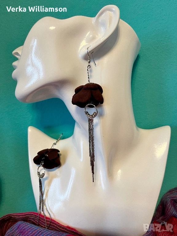 Модел 70. Комплект обици с пръстен от тъмно винено червена естествена кожа → Обява 52666001