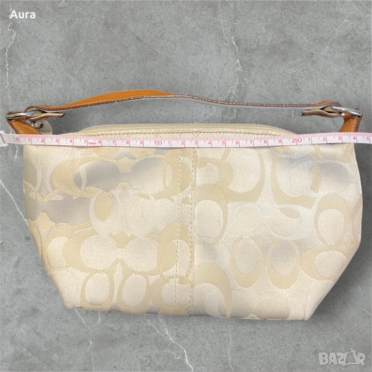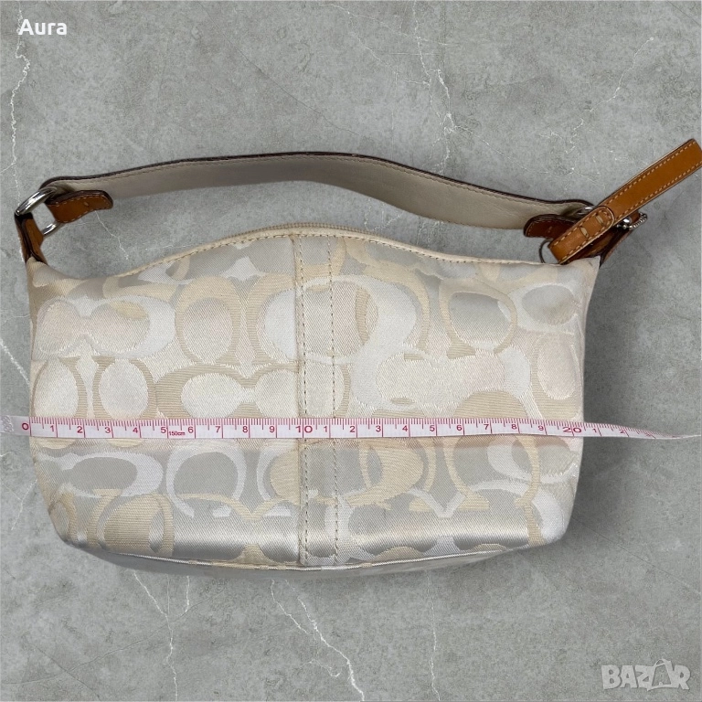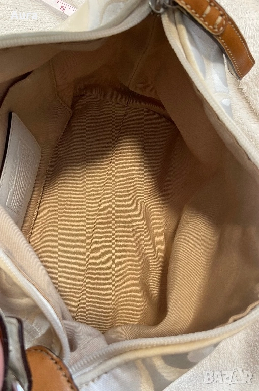 Beautiful vintage Coach bag in the classic beige/cream signature jacquard with tan leather trim, hangtag included.