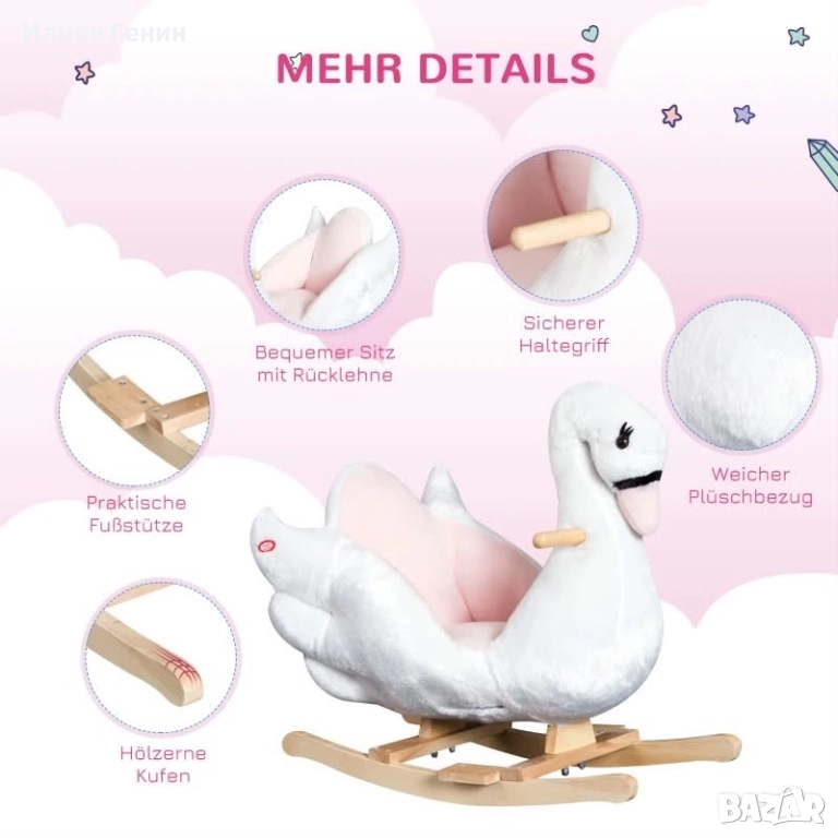 Меко и дружелюбно: Люлеещото се животно е покрито с мек плюшен плат в розово и бяло и е оформено като лебед.