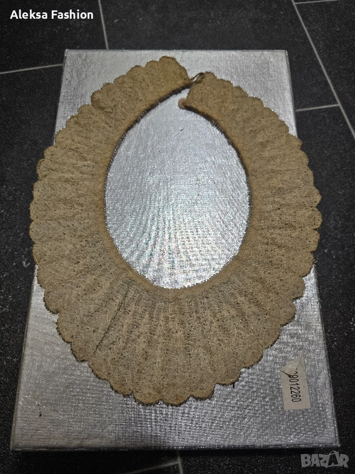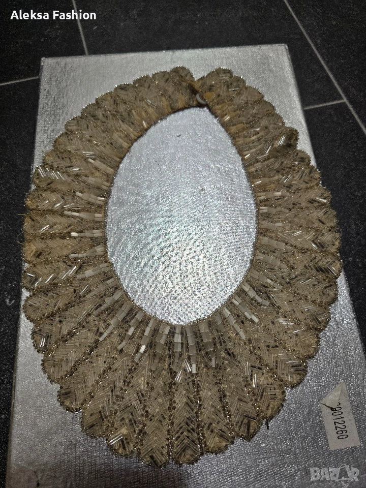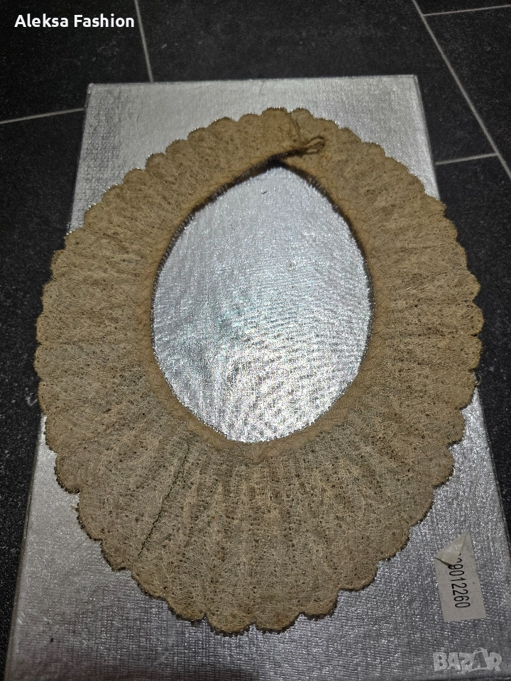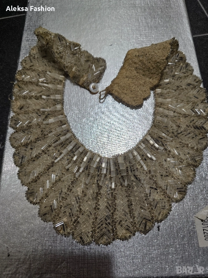 Стар мънистен накит. Изработен е от мъниста пришити върху стара ръчна дантела.