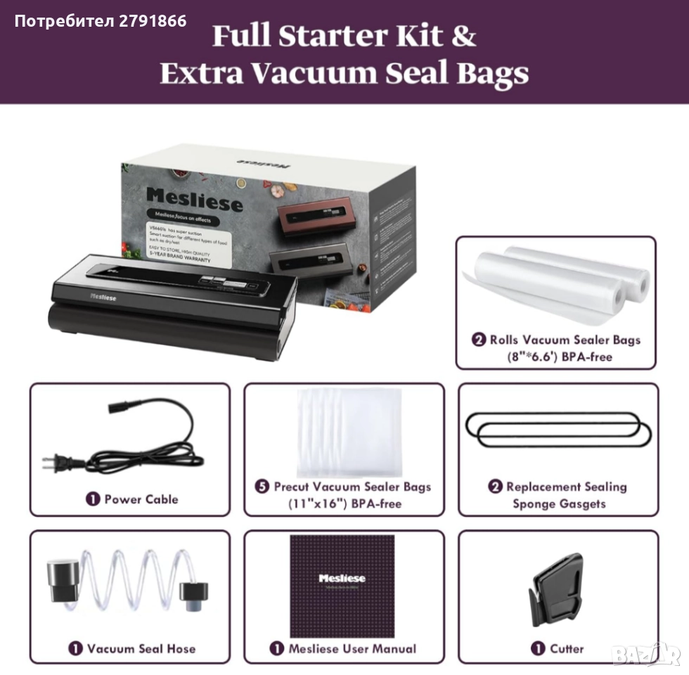 - Ще получите 1x машина за вакуумно запечатване, 2x вакуумни ролки (8"x6.6'), 5x предварително нарязани торбички (без BPA, 11"x16"), 1x ръководство за потребителя, 1x маркуч за засмукване на въздух, 1x захранващ кабел, 2x уплътнителни гъби/уплътнения.