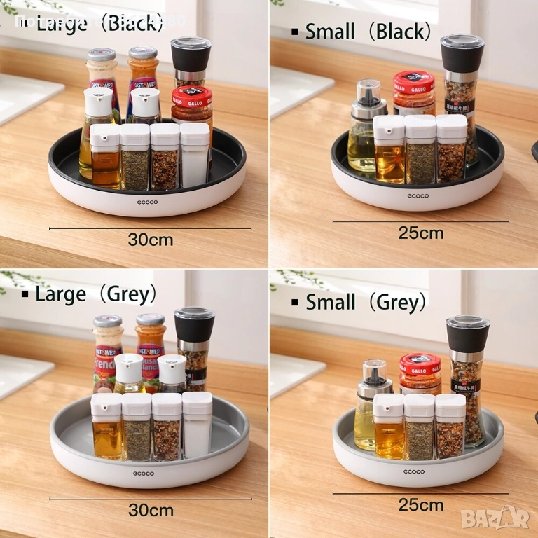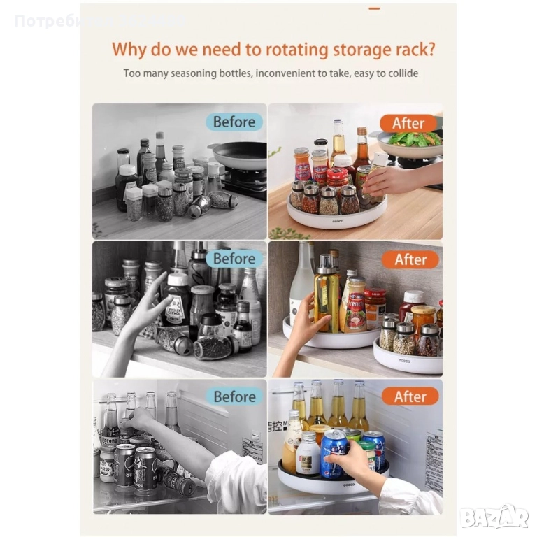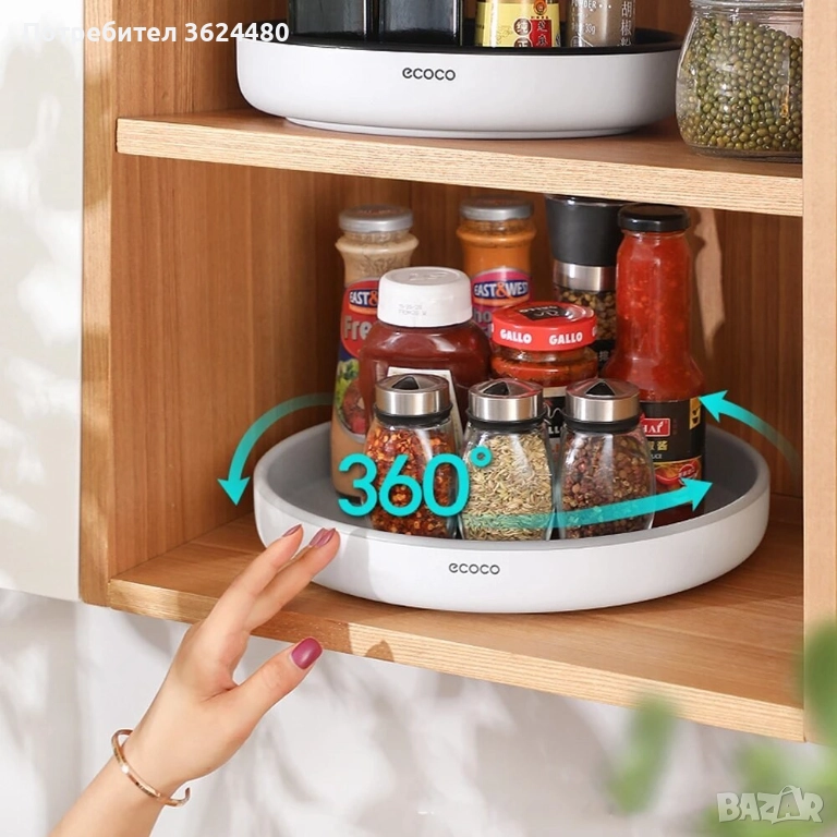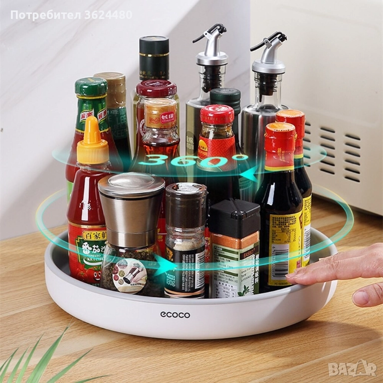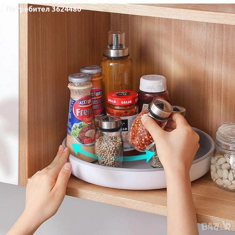 Органайзерът се състои от долна част, въртящ механизъм и табла. Можете да го използвате във всички шкафове, а леко завъртане ще ви покаже всички продукти, които сте подредили отгоре. Освен в кухнята, можете да го използвате и в банята, върху тоалетката или на нощното си шкафче и дори върху масата за хранене.