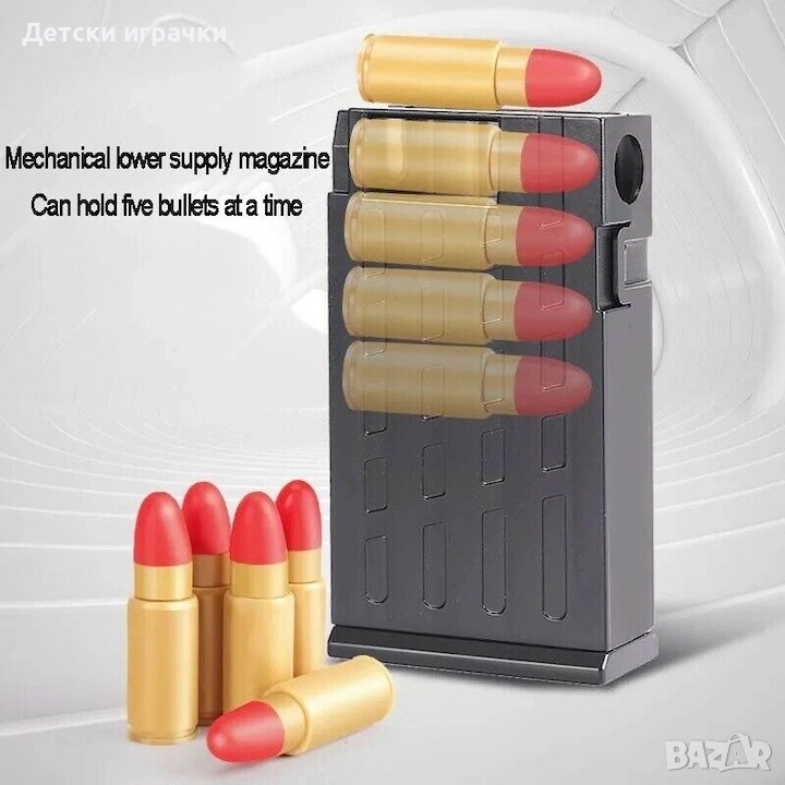 - Класическото зареждане на мобовете, чрез натискането им в товарача, снабден с пружина, ще създаде у децата усещането за зареждане на истинско оръжие. Пълнежът е с максимален капацитет от 5 куршума.