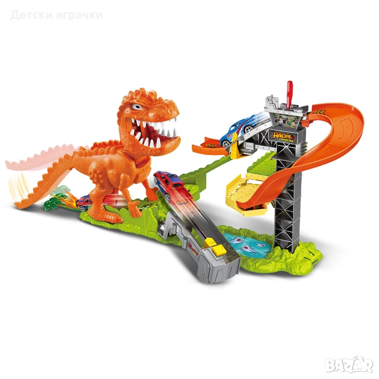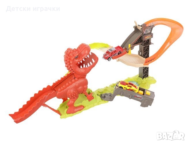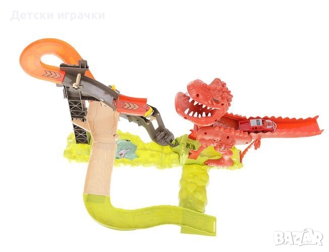 Детска играчка - автомобилна писта-динозавър с опашка-рампа, звуци на динозавър и включен метален автомобил, която ще достави безкрайни часове игра и забавление на Вашето дете.