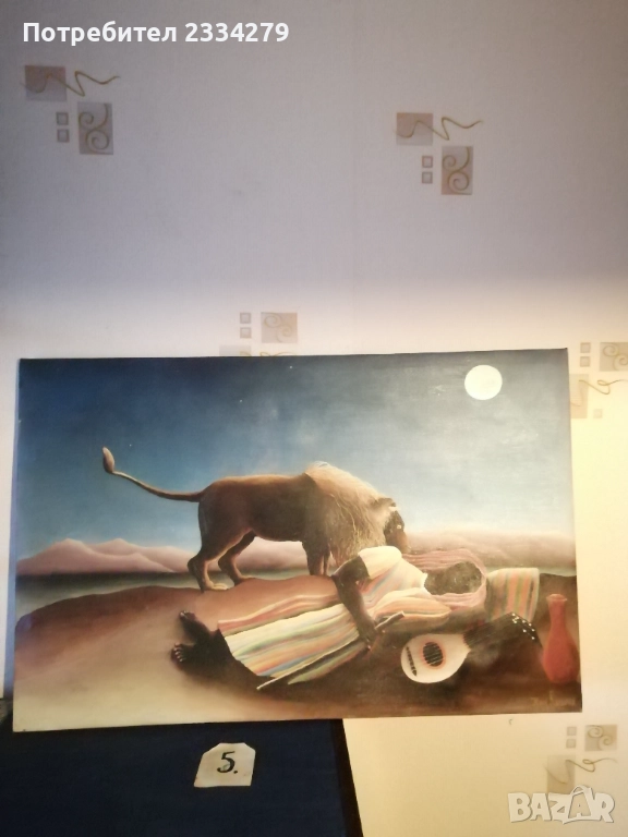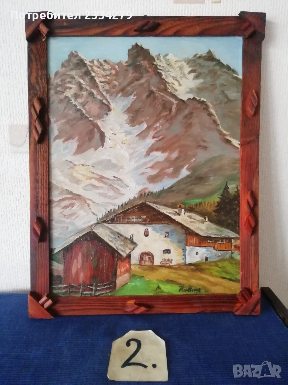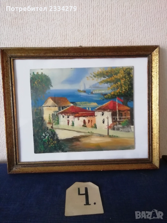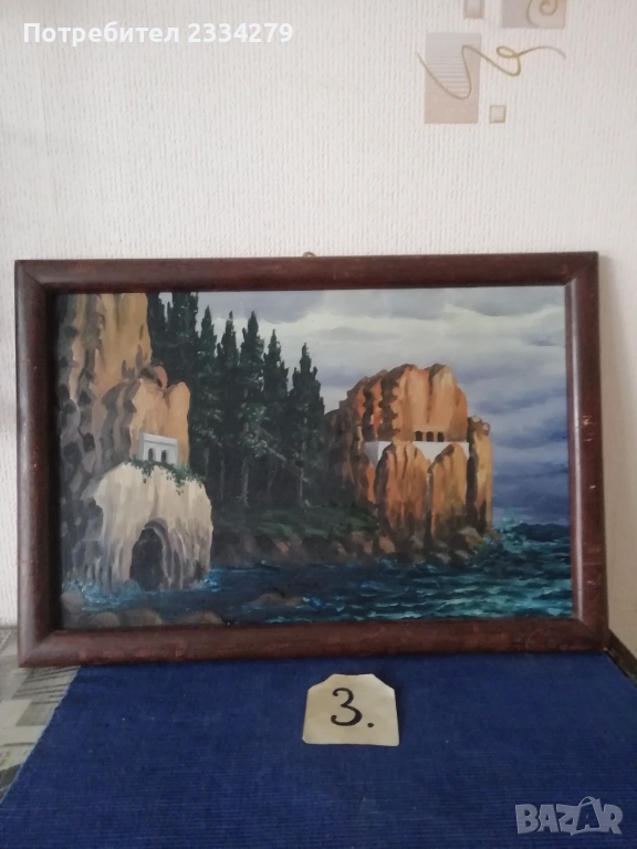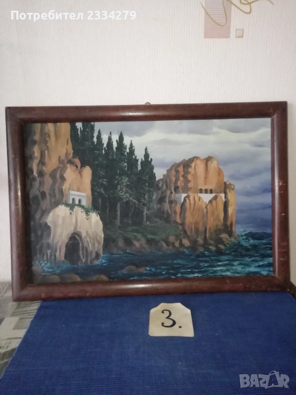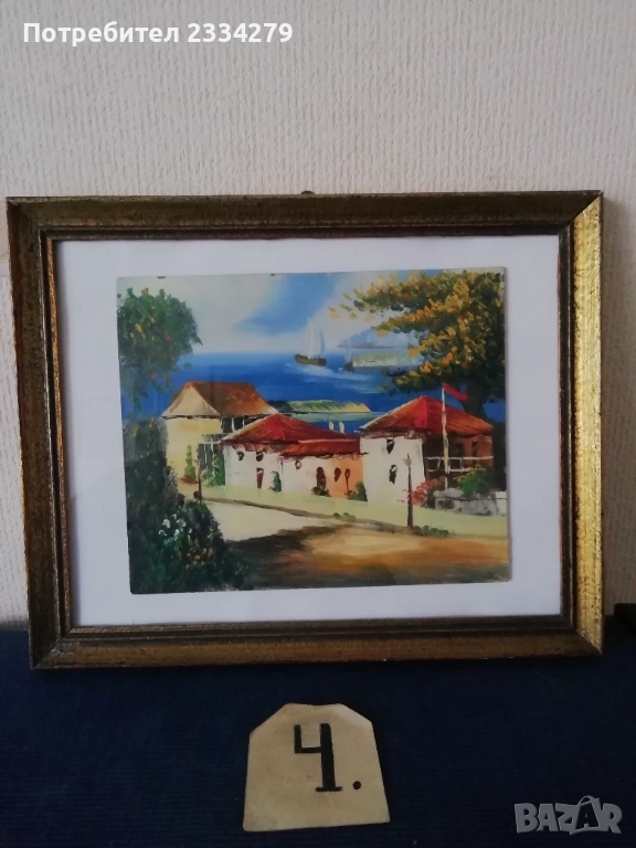 Стари картини рисувани от различни художници-автори в различни държави. N:1 пейзаж а картина с маслени бои върху платно в орнаментирана дървена рамка с размери 45х35см., цена 13€; N:2 зимен пейзаж маслени бои върху талашит е картон, размери 45х35см., цена 16€; N:3 морски пейзаж ,,Островът на мъртвите Флоренция" на Арнолд Бьоклин, ръчно рисуван с акварелни бои върху художествен картон-лист поставен в дървена рамка с размери 52х36см., цена 10€.; N:4 пейзажа картина ,, морски град" рисувано ръчно с маслени бои върху картон поставен в остъклена орнаментирана рамка с размери 37х30см., цена 10€; N:5 картина Henri Roussrau 1894год., маслени бои върху платно, репродукция стил пост импресионизъм Анри Руссо (1844-1910), цена 20€.
