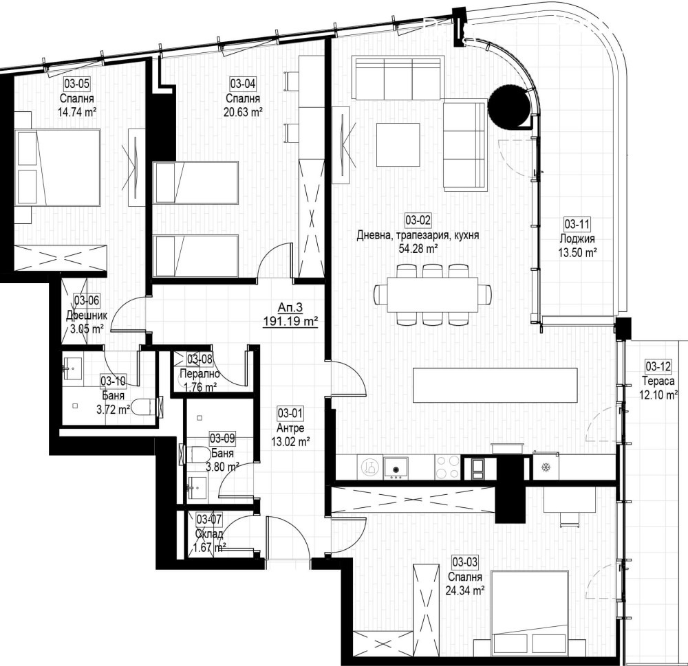 Разпределение: дневна с трапезария и кухнески бокс, лоджия, склад, мастър спалня с дрешник и собствена баня, още две спални, перално помещение, тераса.