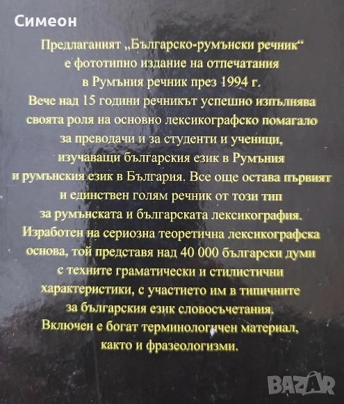 Предлаганият Българско-румънски речник / Dicţionar bulgar-român е фототипно издание на Dicţionar bulgar-român от Тибериу Йован, отпечатан в 1994 г. от издателството за научни издания Editura ştiinţifică в Букурещ.