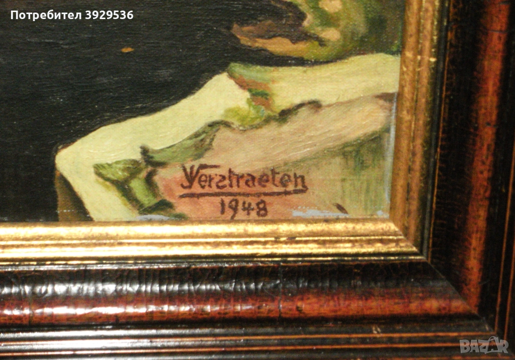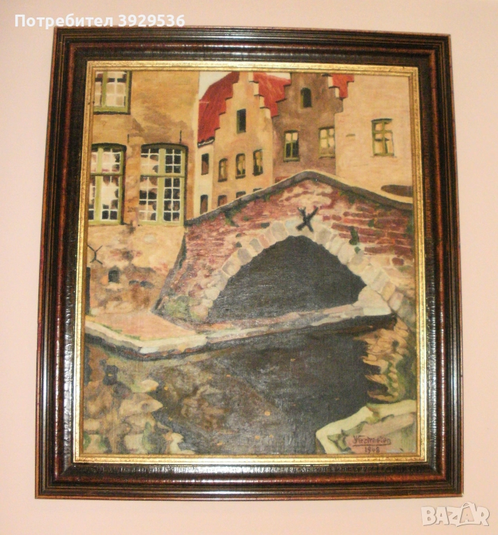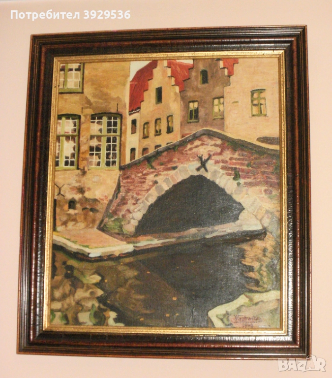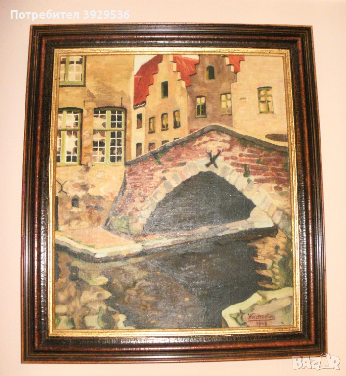 „Изглед към Брюж/ Мостът" в рамка, Белгия, Подпис: Jules Verstraeten/Жул Верстратен. ЦЕНА 350 лева!!! Подпис: долу вдясно Jules Verstraeten/Жул Верстратен; Маслена картина върху дървен панел, в много добро състояние; Тема: Мостът и каналите на Брюж, Белгия; Период: 1948 г.; Формати: с рамка 64x55.5 см - без рамка 52.5x44 см; Рамка: дървена, в много добро състояние с минимални забележки. Картината е с тегло 3.3 кг. Jules Verstraeten е роден в Zottegem на 08/05/1903 и починал в Zottegem на 22/10/1976, Белгия. Той е трето поколение много талантлив и продуктивен белгийски художник, който освен изложби в Източна Фландрия: Гент (1924,32,35,41,50,52,62,69,73), Zottegem (1922,30,38,54,56,61,69,71,74), Aalst ( 1927,68), Oudenaarde (1925), Geraardsbergen (1967) и др., неговите произведения са били показвани и в Брюксел (1923,47,62,63,65), Брюж (1931), Tournai (1933), Лиеж (1944) , Люксембург (1946) и дори в Париж (1963,65). Излага и с групата “La Jeune Peinture Belge” в Брюксел (1922,23,24). Получава няколко награди: Сребърен медал „Изкуство в Европа“ в Брюксел (1965) с творбата „Червеният пейзаж“, Кавалер на ордена на Леополд (1969) и златен медал „Изкуства, науки и литература в Париж (1970) с творбата „Les champs d'or“. Ще получите картината, която виждате на снимите!!!