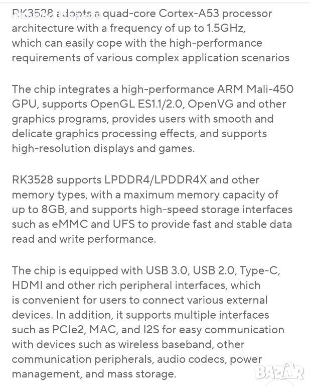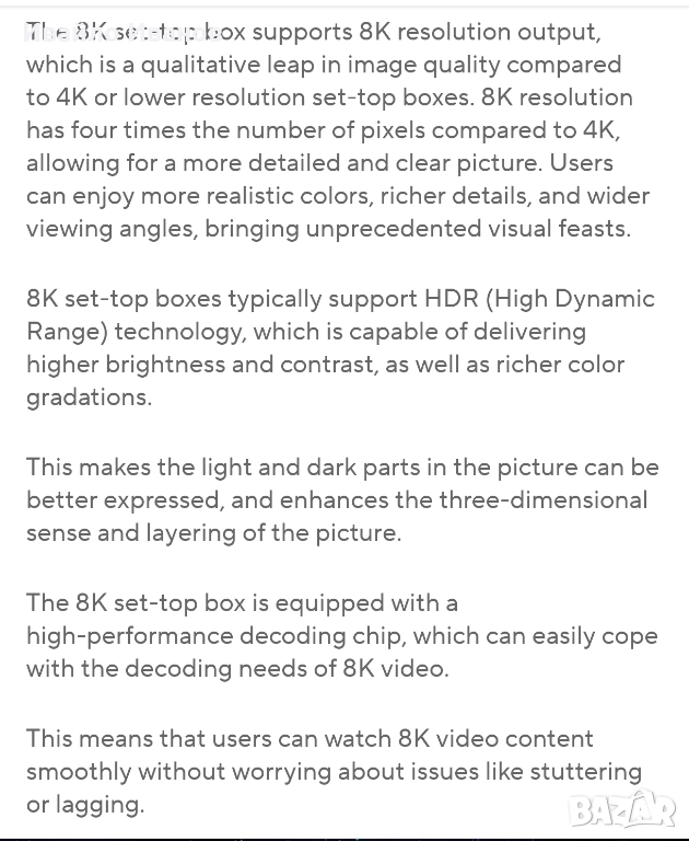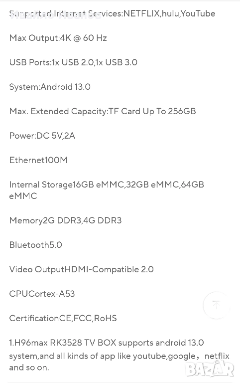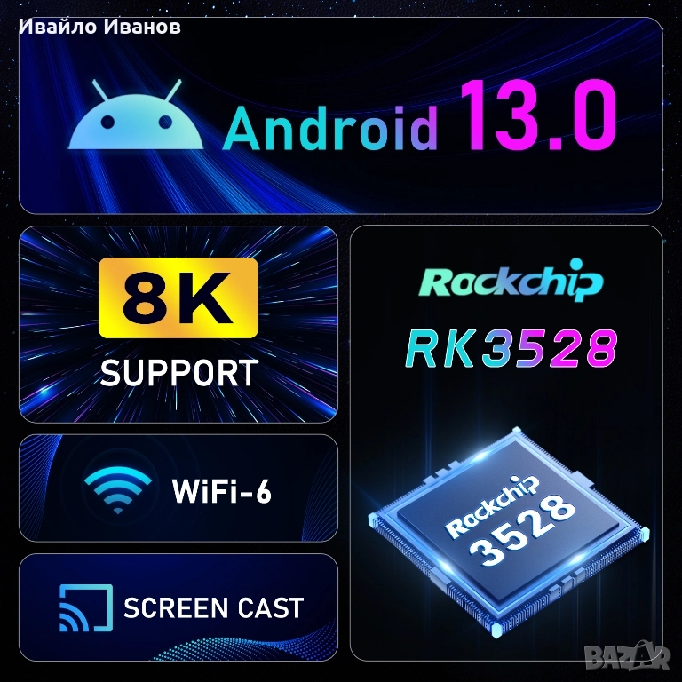 TV Box, мултимедийно устройство, което превръща обикновения телевизор в смарт телевизор. Основни характеристики Операционна система: Работи с Android 13.0. Процесор: Оборудван е с четириядрен 64-битов процесор Rockchip RK3528 Cortex-A53. Памет: Този конкретен модел разполага с 4 GB RAM и 64 GB вградена памет. Видео: Поддържа възпроизвеждане на видео с резолюция до 8K Ultra HD и H.265 декодиране. Свързаност: Включва двулентов WiFi 6 (2.4G+5G) и Bluetooth 5.0 за бърза и стабилна връзка. Портове: Разполага с HDMI 2.1 изход, USB 3.0 и USB 2.0 портове, както и Ethernet порт. Функции: Позволява достъп до приложения като Netflix, YouTube, Prime Video и много други чрез Google Play Store.