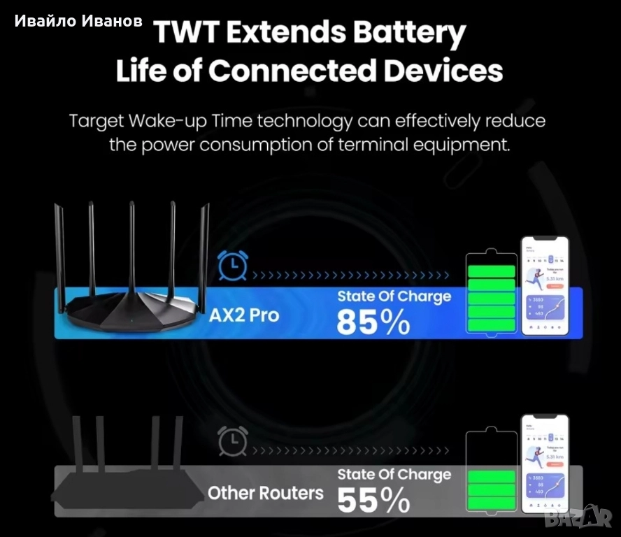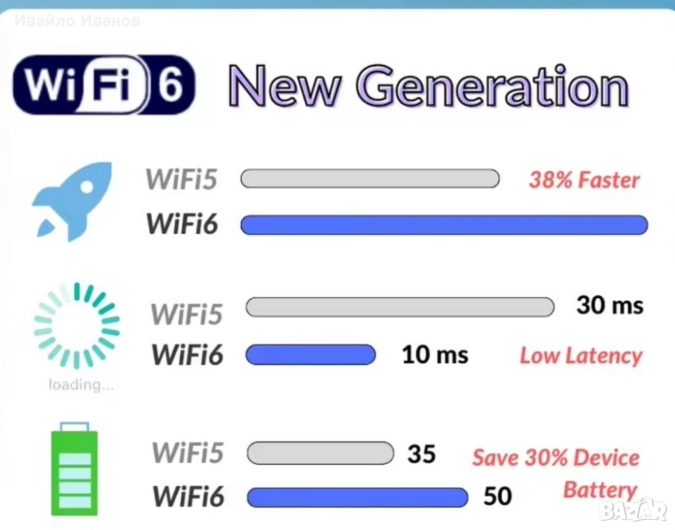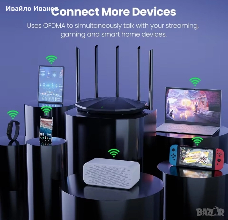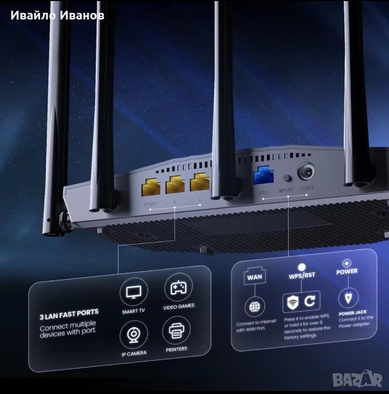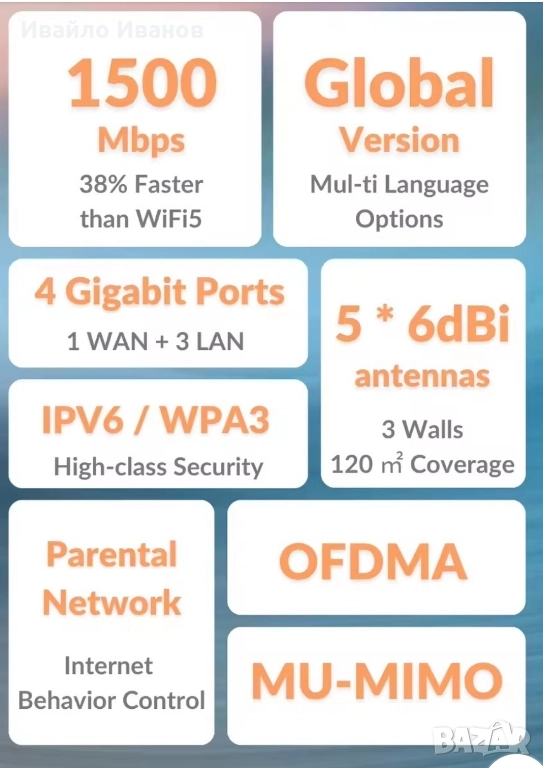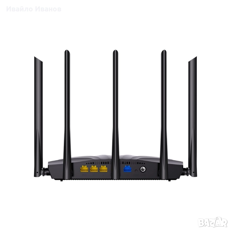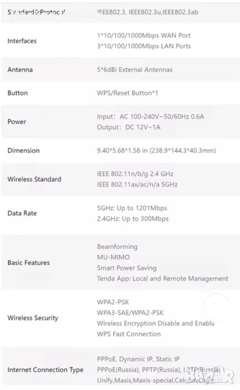 Tenda RX2 Pro Wi-Fi 6 AX1500. Основни характеристики Технология: Рутерът е от ново поколение Wi-Fi 6, който използва технологии като MU-MIMO и OFDMA за значително подобряване на мрежовата производителност и ефективност, намалявайки забавянето при едновременно свързване на множество устройства. Скорост: Осигурява комбинирана скорост до 300 Mbps в лентата 2.4 GHz и 1201 Mbps в лентата 5 GHz). Покритие: Снабден е с 5 външни 6 dBi антени с висок коефициент на усилване и модул за усилване на сигнала, което спомага за елиминиране на "мъртвите зони" и осигурява покритие в средни до големи домакинства. Портове: Разполага с пълен набор от гигабитови портове: 1x WAN порт и 3x LAN порта, всички със скорост 10/100/1000 Mbps, което гарантира бърза кабелна връзка. Сигурност и контрол: Поддържа най-новия стандарт за сигурност WPA3 за защита на мрежата. Включва функции като родителски контрол, мрежа за гости и управление чрез приложението Tenda.