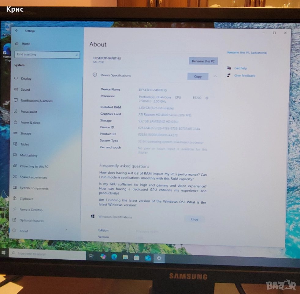 PC с монитор Samsung, 1ТB памет и Windows 10, напълно работещ. Спецификите са на една от снимките.