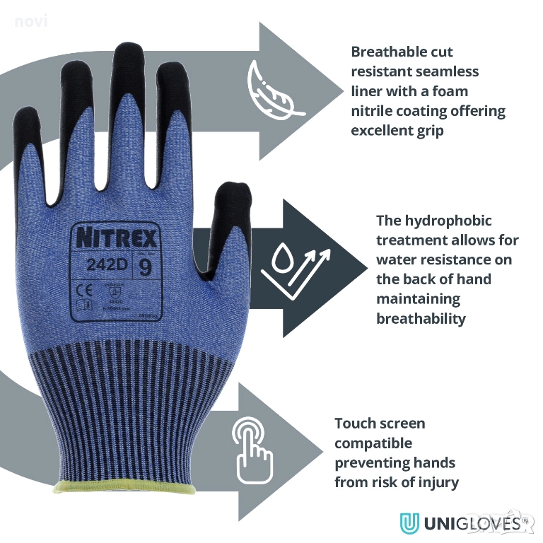 Unigloves NITREX 242D са висок клас предпазни (работни) ръкавици, предлагащи отличен баланс между висока защита срещу срязване, гъвкавост, комфорт и прецизност в задачите. Създадени за професионалисти, които работят с остри предмети, но се нуждаят от прецизност, този модел е идеалният избор за монтажни и индустриални дейности.